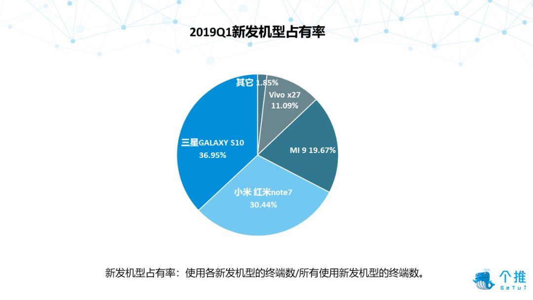 从2019Q1各品牌新发机型占有率来看,三星GALAXY S10在所有新发机型中占有率最高。2月21日上市以来,短短一个月时间即成为三星手机用户换机机型首选,相信在二季度可以跻身三星手机机型分布Top5。