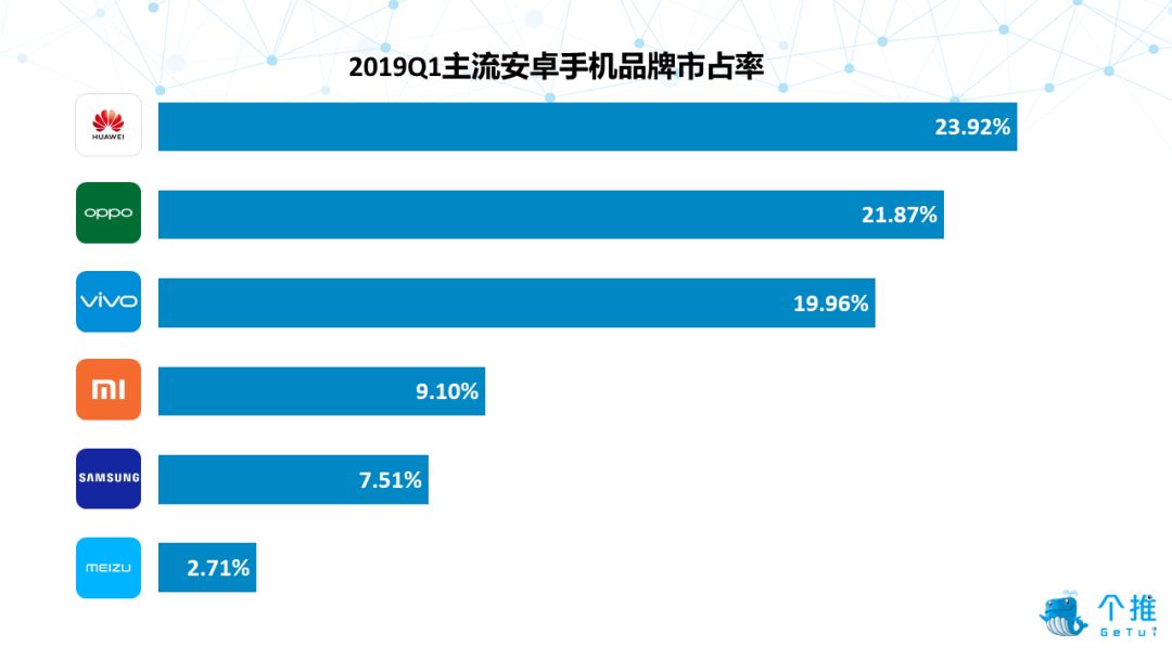 - 2019Q1华为市占率23.92%,连续三个季度保持安卓智能手机市场第一的位置;