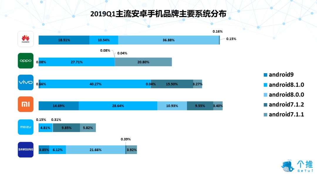 - 用户更新手机系统的热情不高,在各安卓手机品牌用户中,更新系统至android9的用户占比均不高;