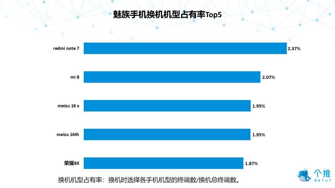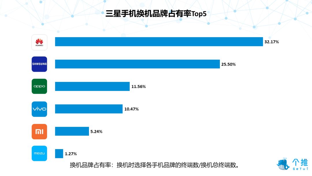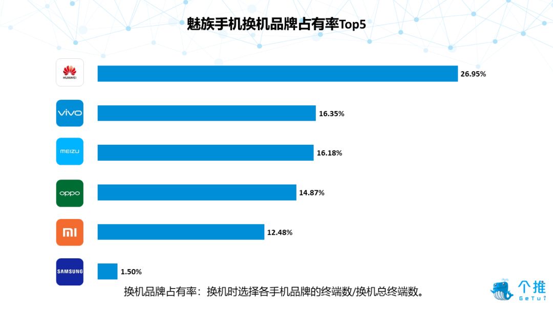 个推大数据在对用户的换机品牌偏好进行洞察时,发现大部分用户在换机时更倾向于选择原手机品牌,魅族和三星手机用户在换机时首选华为手机。