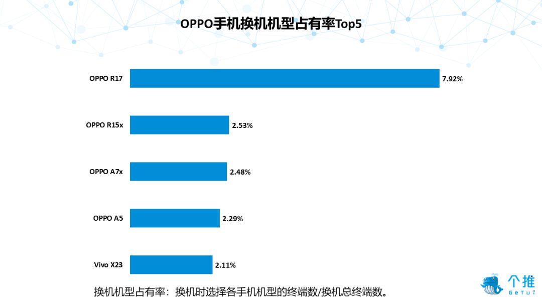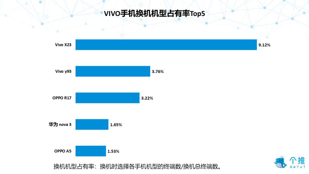 - 手机品牌上,用户换机时更倾向于选择原手机品牌,手机机型上,Vivo X23和OPPO R17是用户换机时选择的热门机型;