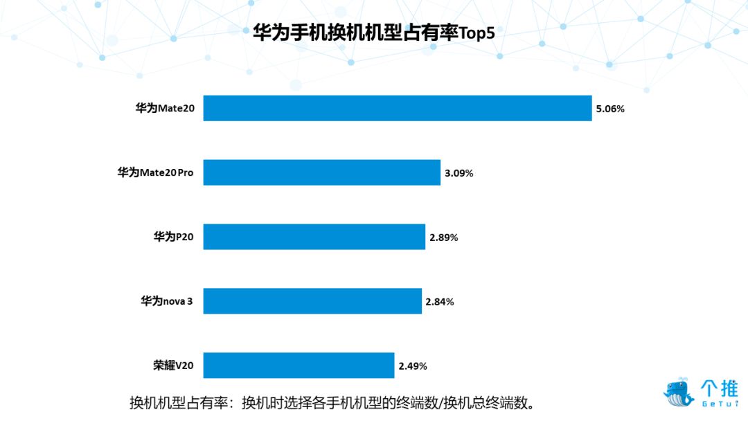 - 华为手机迭代更新速度较快,手机机型丰富,用户使用Top5机型占比17.14%;