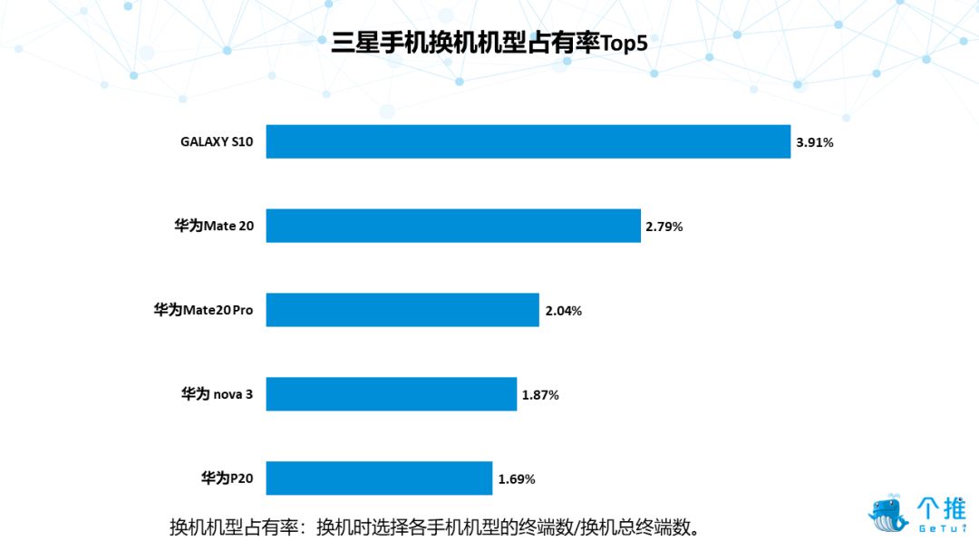 - GALAXY S10表现不俗,上市一个月即成为三星手机用户换机机型首选,推动三星手机市占率环比上升2.4%;