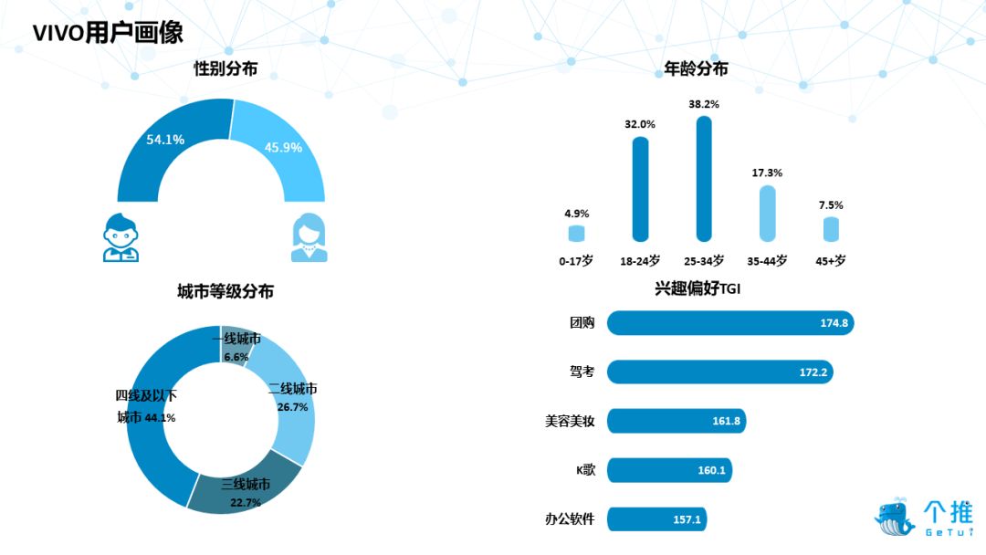 VIVO手机用户中男性占比54.1%,18~34岁用户占比70.2%,该部分人群同样偏年轻化,且主要来自四线及以下城市,兴趣偏好TGI数据显示,VIVO手机用户群体对团购、驾考和美容美妆更感兴趣。