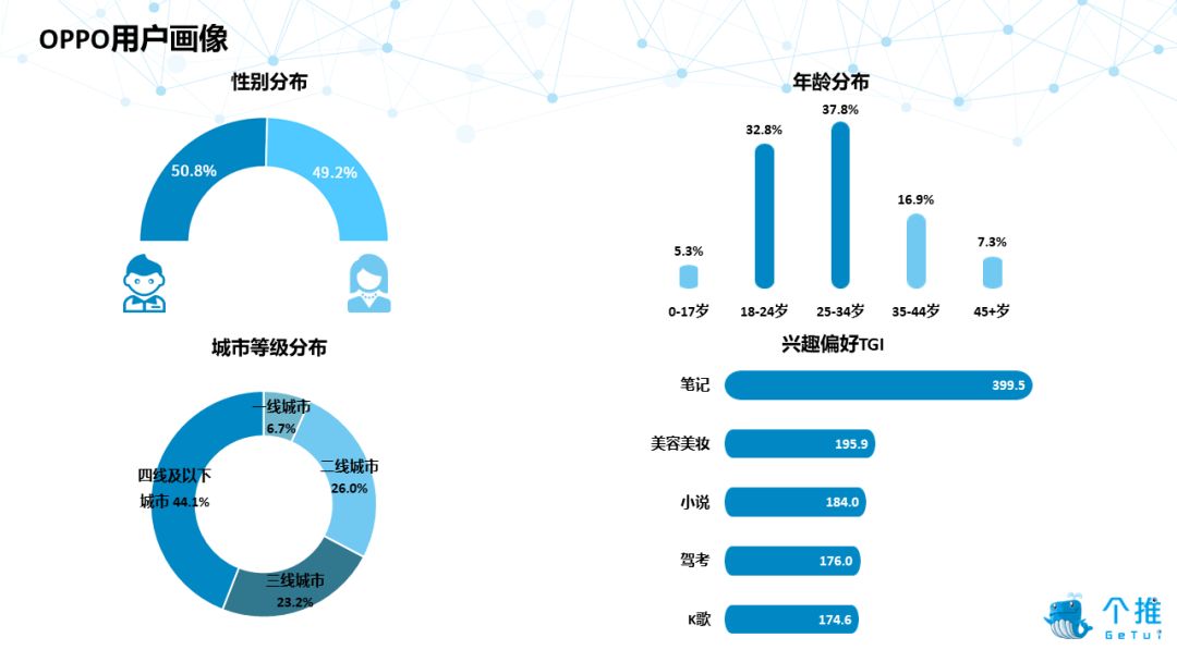 OPPO手机用户中性别差异不大,男性和女性占比分别为50.8%和49.2%,从年龄分布来看用户偏年轻化,18~34岁用户占比达到70.6%;从城市等级分布来看,用户主要来自四线及以下城市。