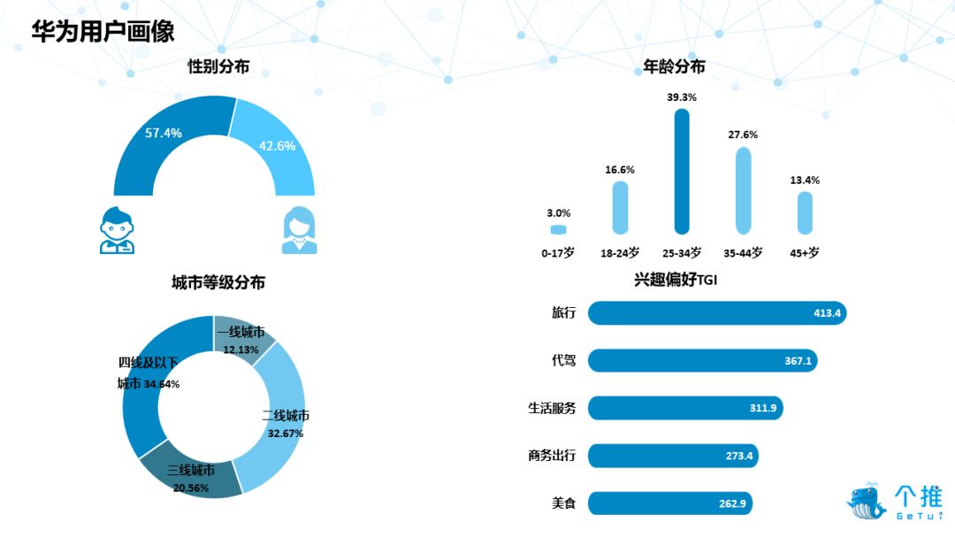 华为手机用户中男性占比为57.4%,25~34岁用户占比39.3%,兴趣偏好TGI数据显示,华为手机用户人群喜欢旅行、代驾和商务出行,和其他人群相比更偏商务精英范儿。