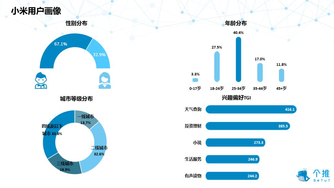 小米手机用户中男性占比达到67.1%,为所有手机品牌中男性用户占比最高,年龄主要集中在25~34岁,用户主要来自二线及以下城市,兴趣偏好TGI数据显示,小米手机用户更注重生活休闲。