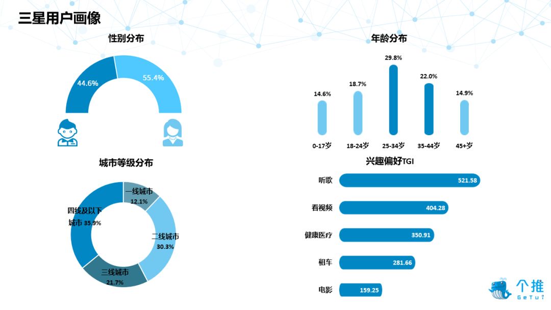 三星用户中女性居多,女性用户占比为55.4%,年龄集中在25~44岁,兴趣偏好TGI数据显示,三星用户有更多的闲暇时间,对听歌、看视频和健康医疗更感兴趣。