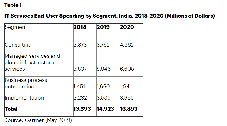 根据Gartner的数据,2019年印度IT服务支出总额将达到近150亿美元,比2018年增长9.8%。业务流程外包(BPO)支出预计将在2019年实现最快增长,同比增长14.4%。