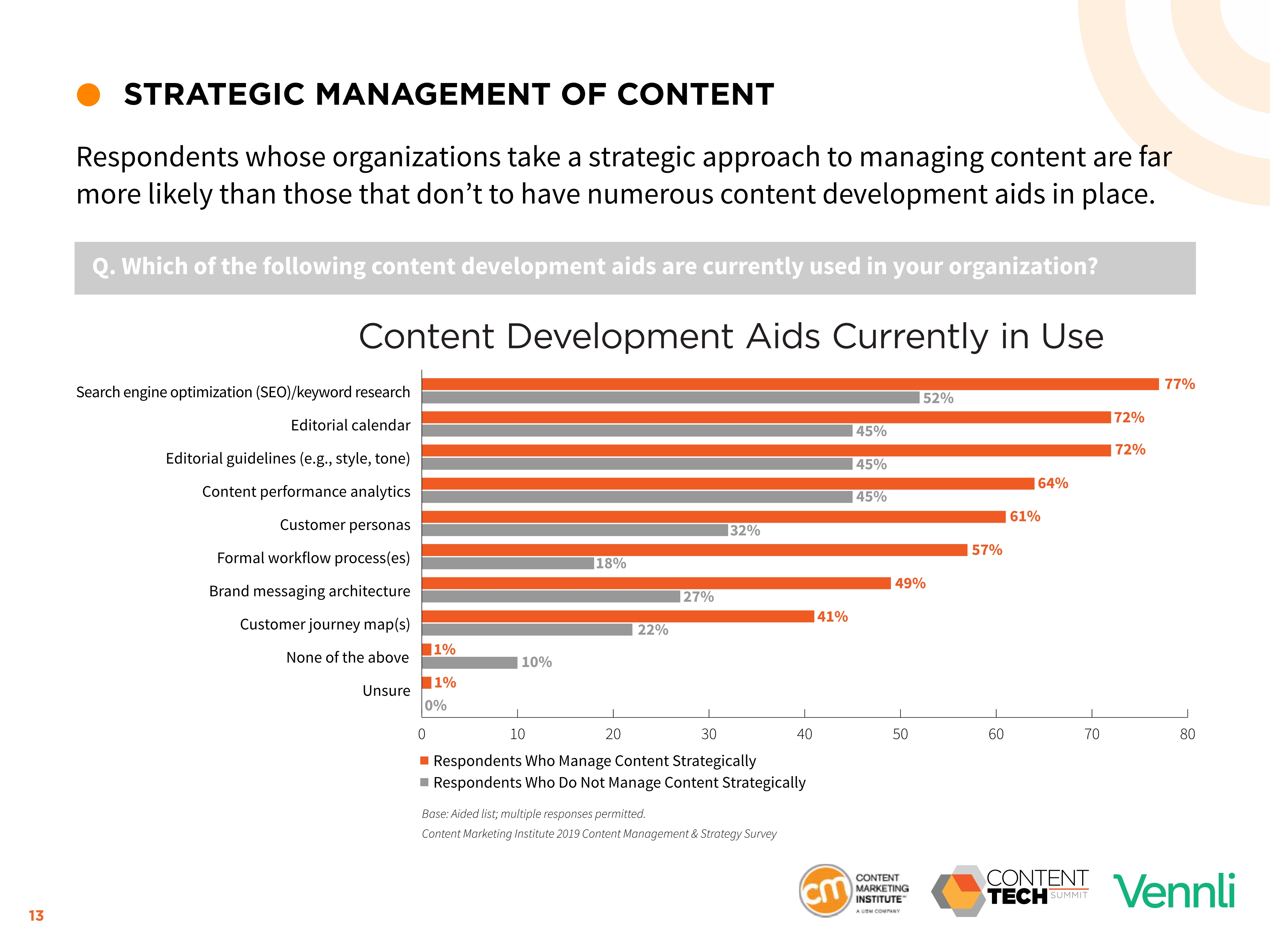 调查发现,超过3/4的受访者(77%)使用搜索引擎优化/关键字搜索辅助工具战略性地管理其内容,而不采用战略性方法的企业中仅有一半(52%)这么做。