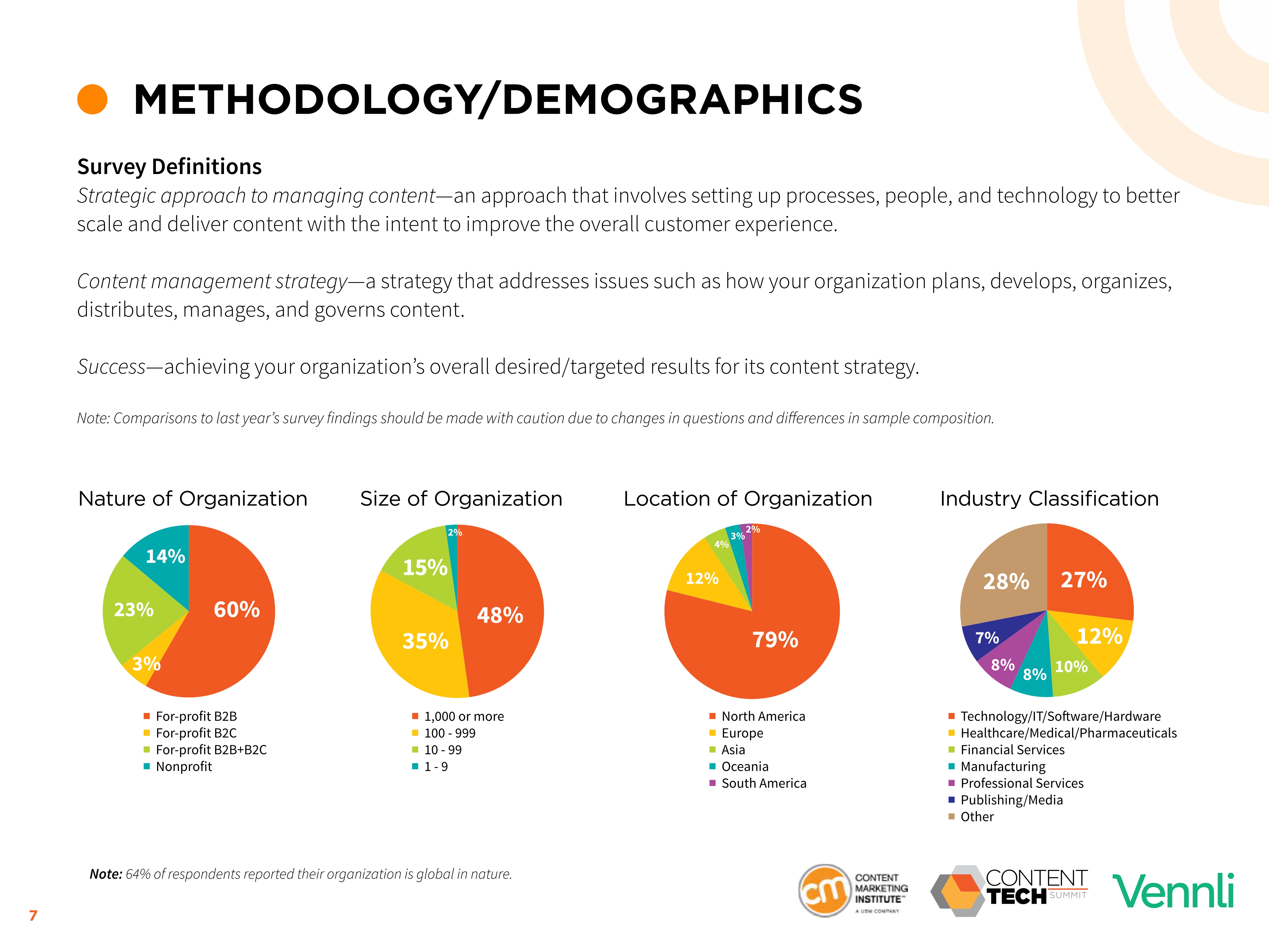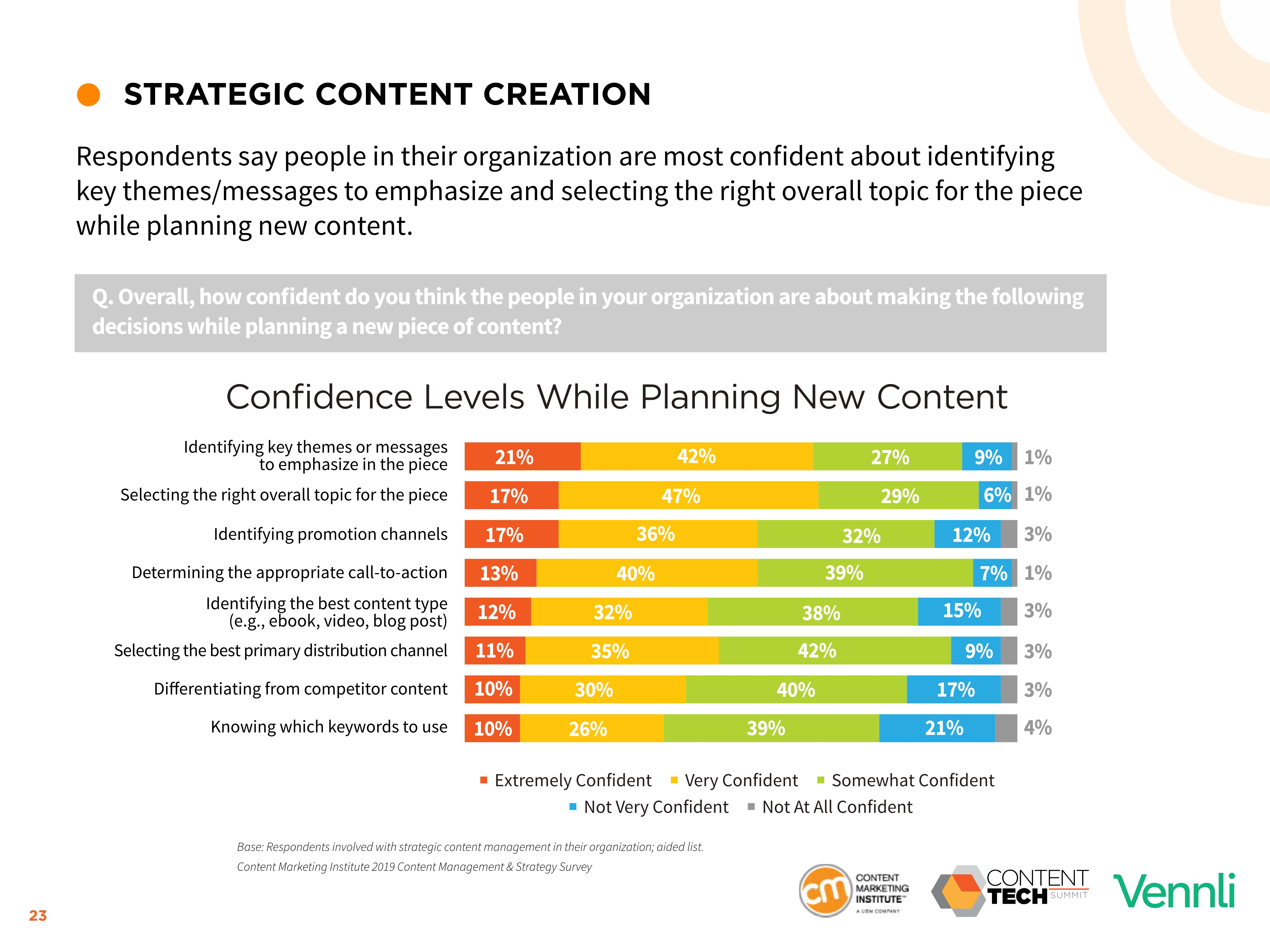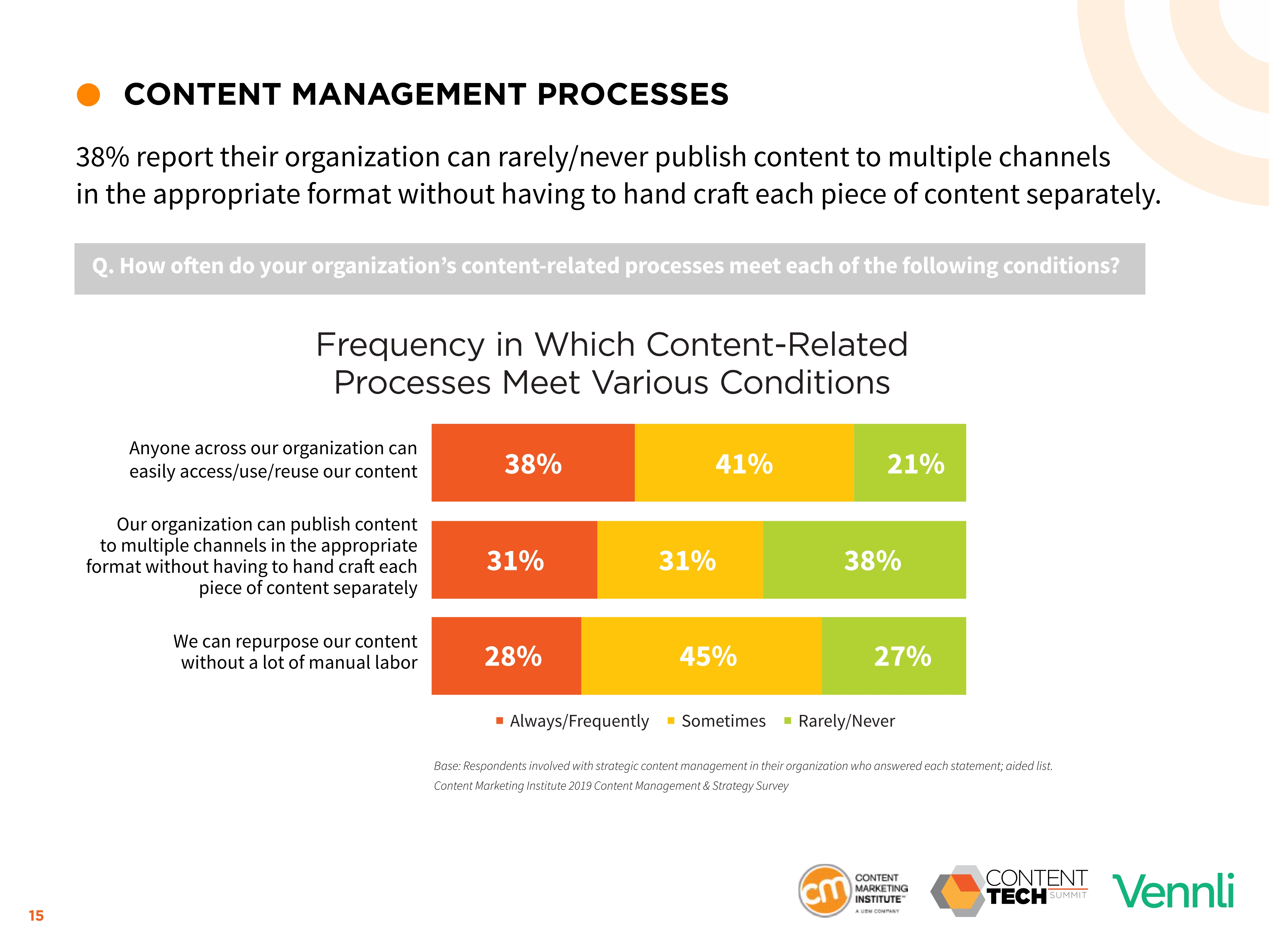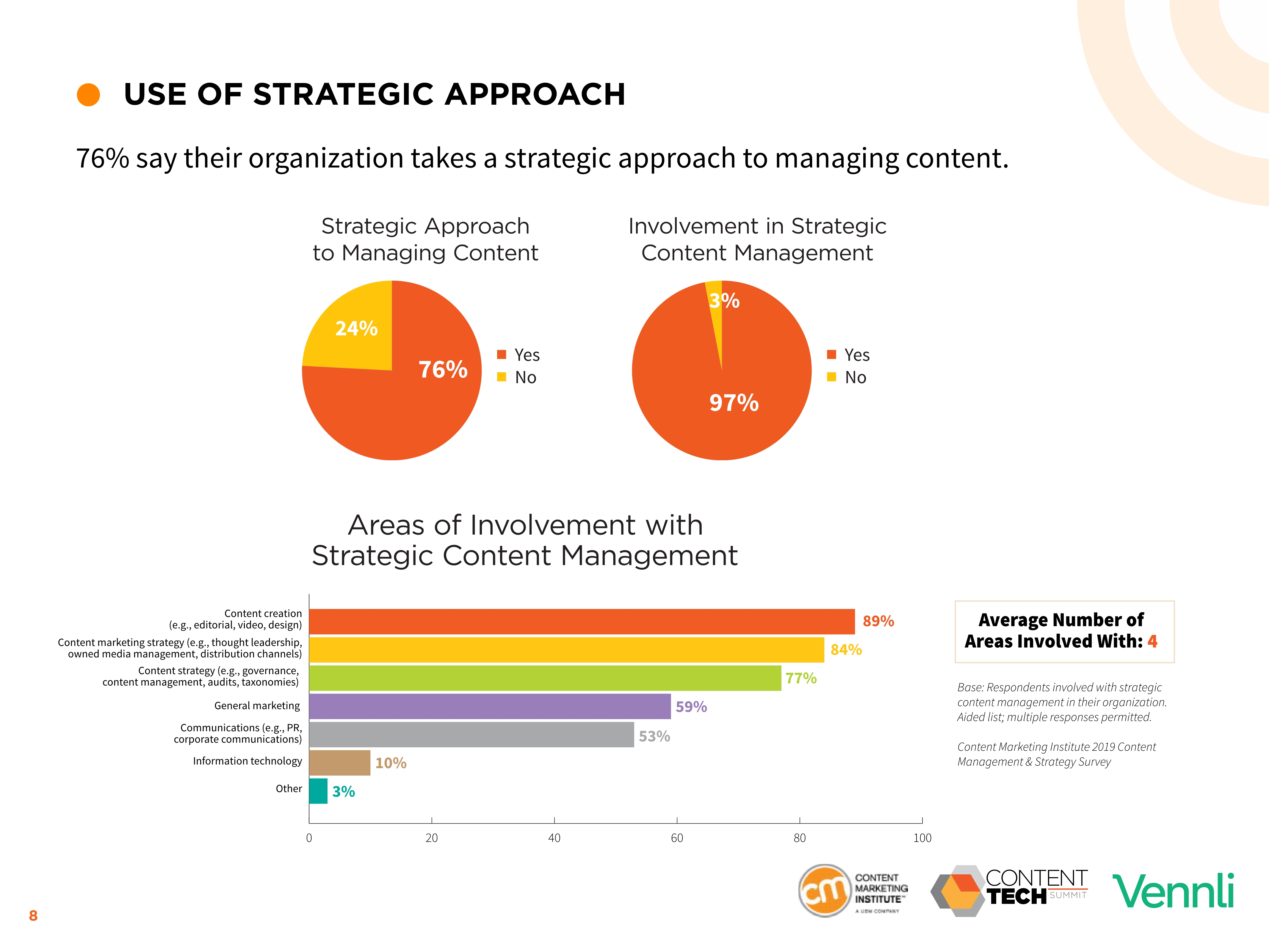 参与战略内容管理的受访者同意(38%)或强烈同意(44%)将内容视为一种商业资产,约7/10的受访者(71%)同意或强烈同意其企业从数据和分析中提取有意义的见解。