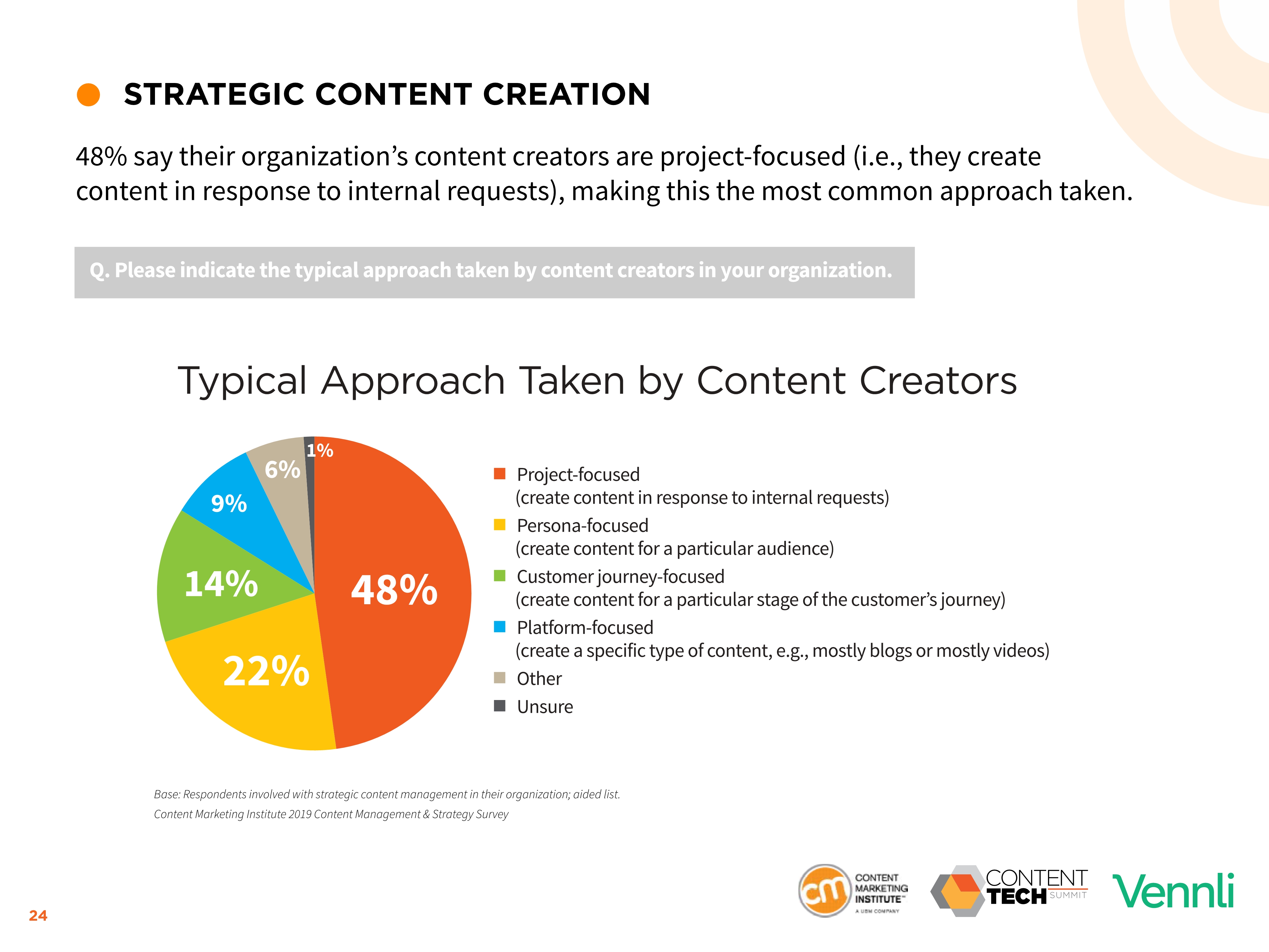 战略性地管理其内容的企业也比不使用的企业更频繁地部署内容日历(72%)和编辑指南(72%)。参与战略性工作的企业与不参与的组织之间最大的差距之一是前者(57%)比后者(18%)使用正式工作流程的可能性高出三倍。