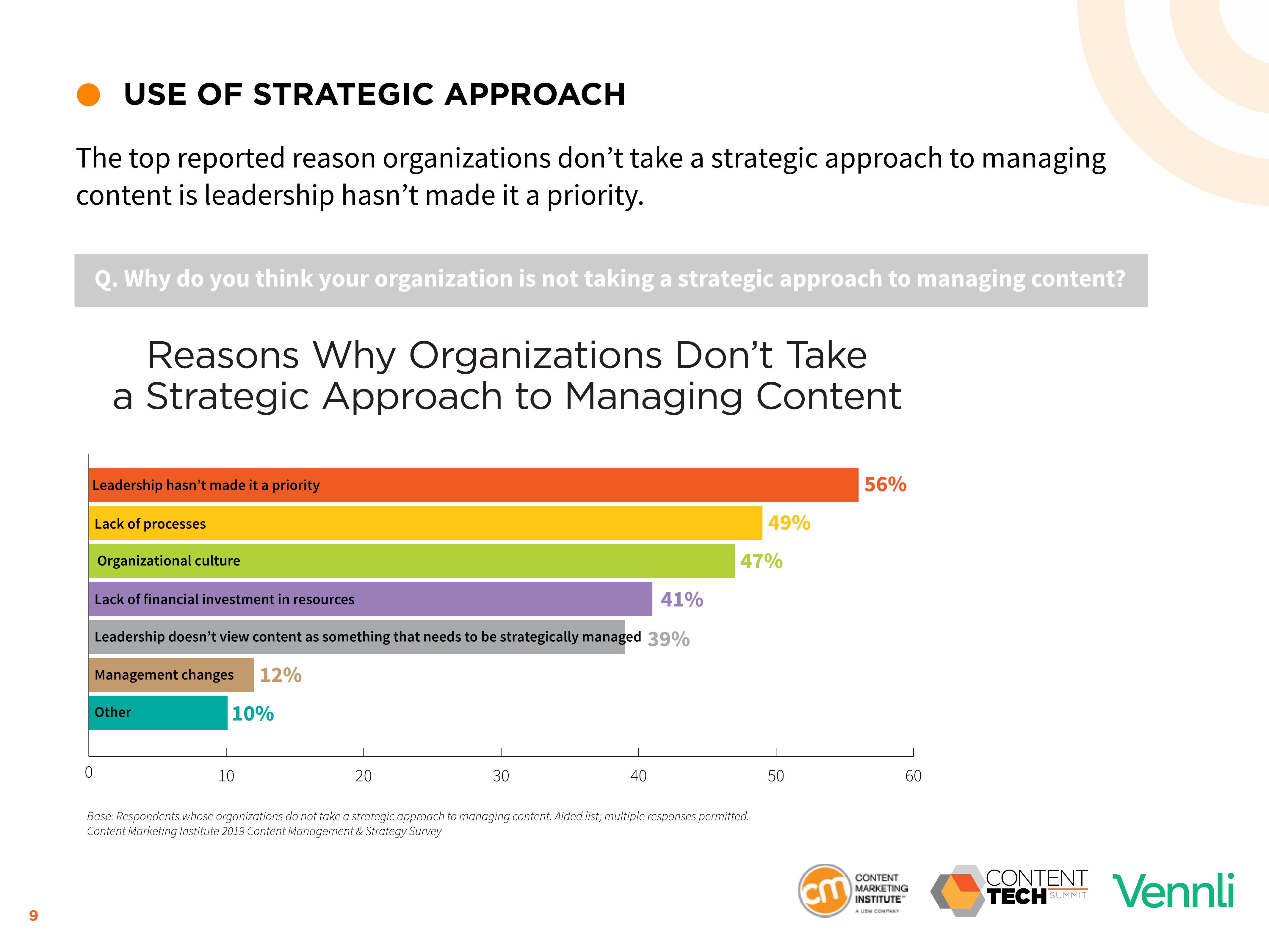 56%的受访者认为领导能力是阻碍企业采取战略方针的主要原因,约39%的受访者认为领导层并不认为内容是需要进行战略性管理的东西。