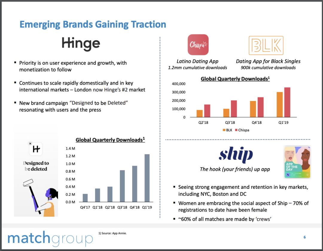 其他新品牌如hinge(严肃婚恋,设计被删除)、Chispa(定位拉丁裔用户)、BLK(定位非洲裔)、ship(好友替你选对象)的目前重点是改善产品体验、扩大用户规模。