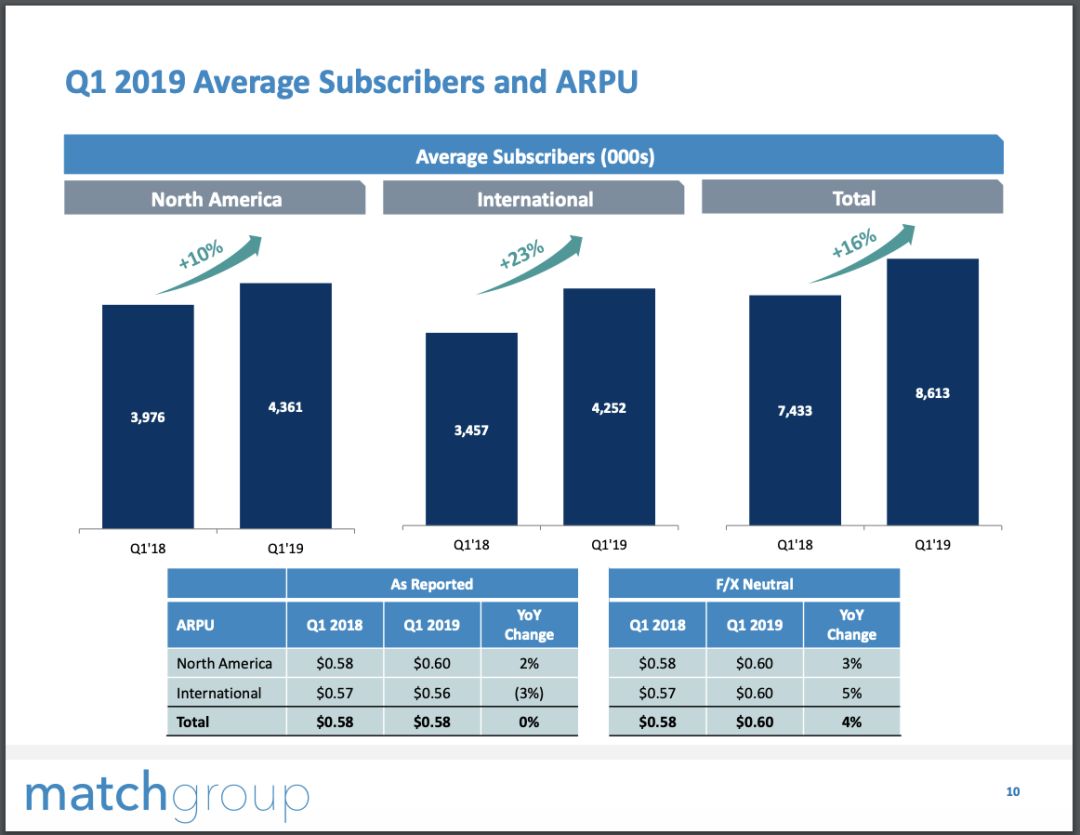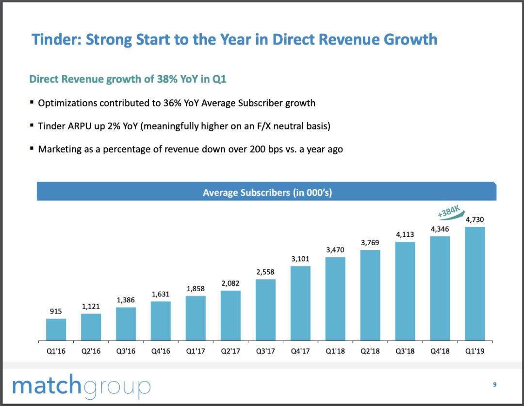 Tinder是驱动付费会员和收入增长的主要动力。Tinder的营收年同比增长38%,付费会员用户数(不含单条服务付费用户)为437.0万,同比增长36.3%,较4季度净增加38.4万,日均ARPU同比增长2%。