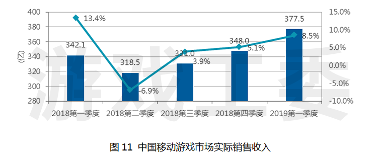 2019年第一季度,中国移动游戏市场实际销售收入为377.5亿元,环比增长8.5%,同比增长10.3%。尽管2018年第二季度中国移动游戏市场实际销售收入骤减,但总体仍呈增长趋势。移动游戏市场实际销售收入同比份额继续增加,占比为64.6%,相比于2018年年均增长率62.5%略有上升,与2018年第四季度的64.8%基本保持一致,移动游戏用户规模为6.2亿人,环比增长2.1%。