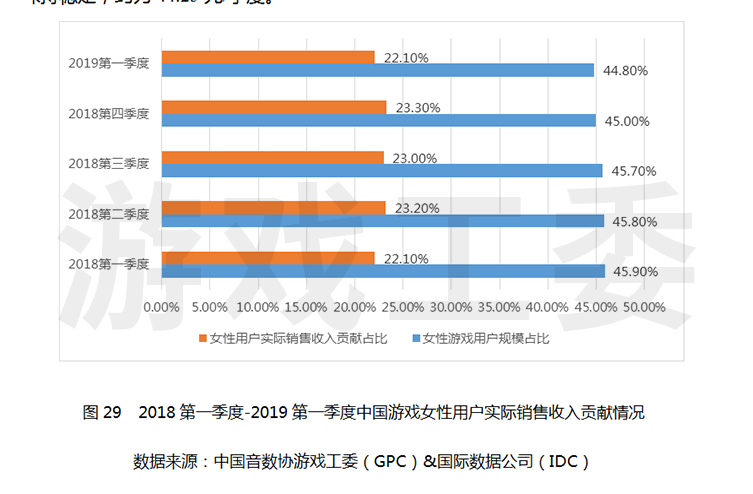 2019年第一季度,中国游戏女性用户规模突破2.9亿人,中国游戏市场女性用户贡献的实际销售收入超129亿,占据中国游戏市场总收入的22.1%。