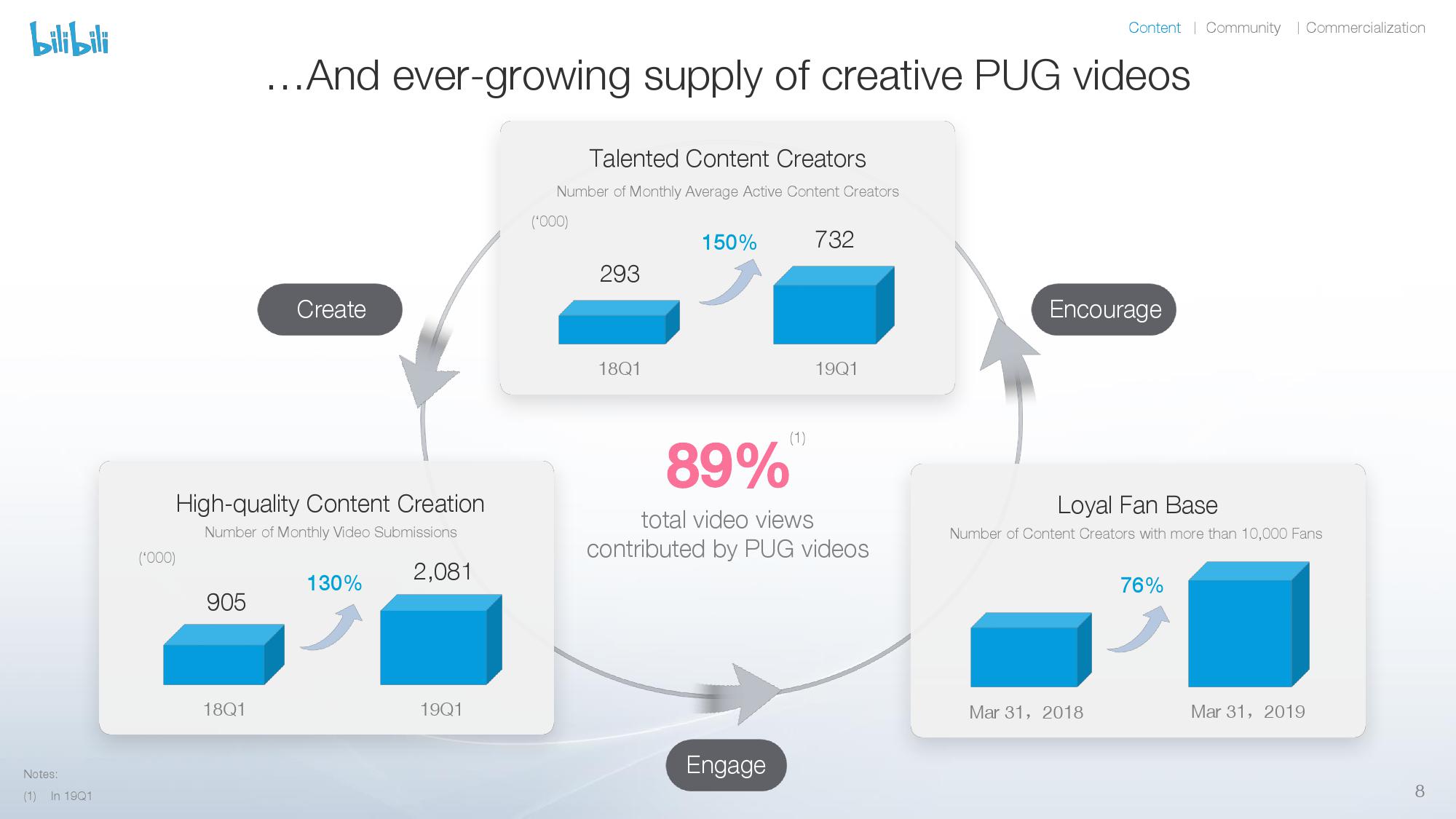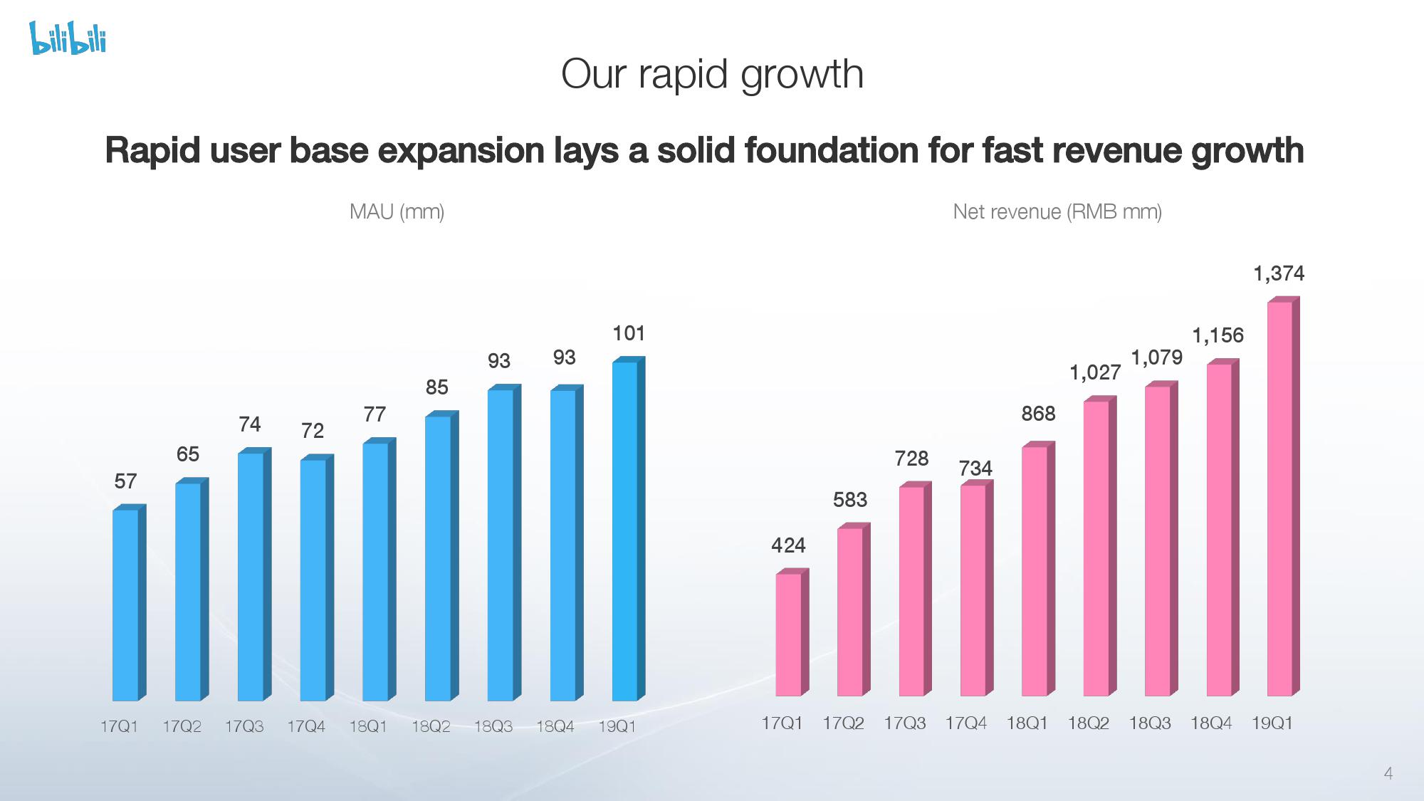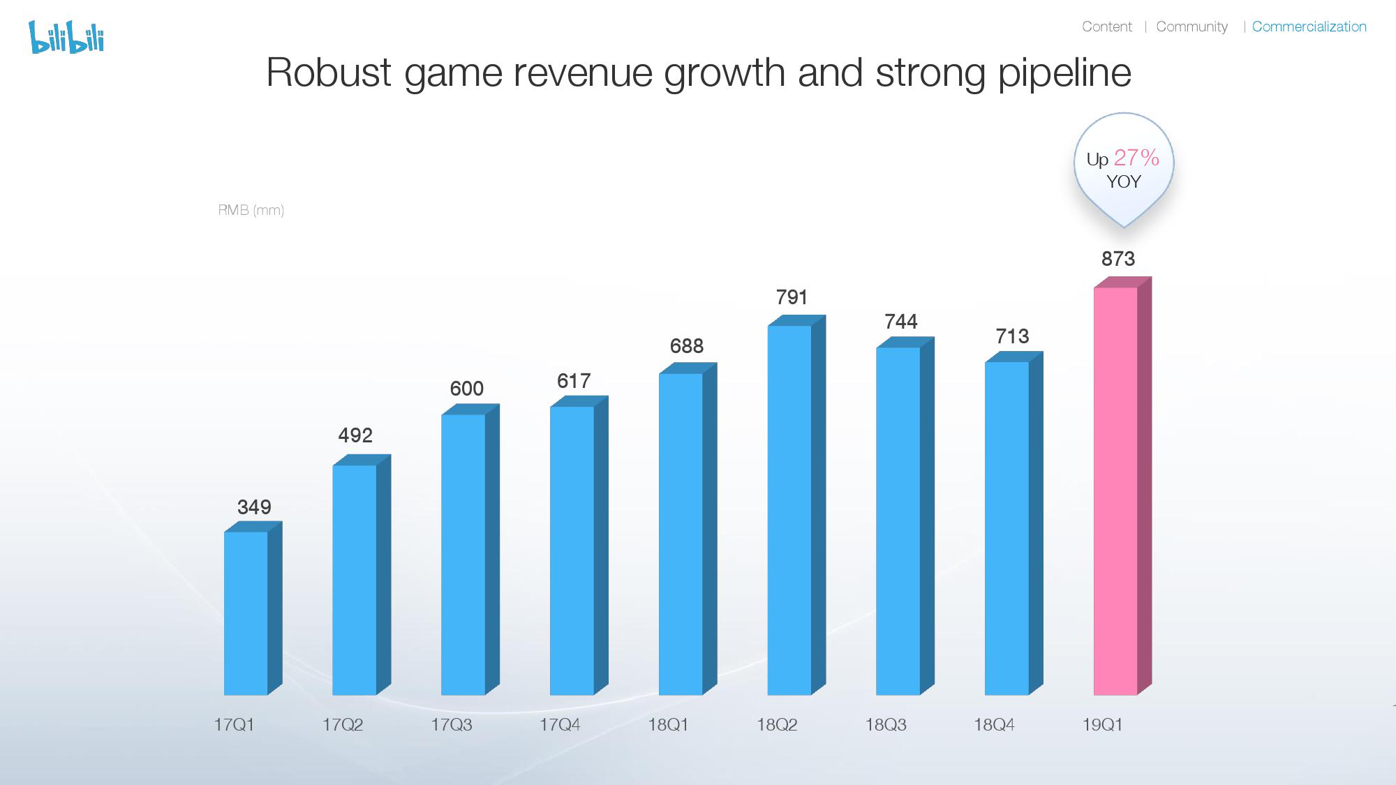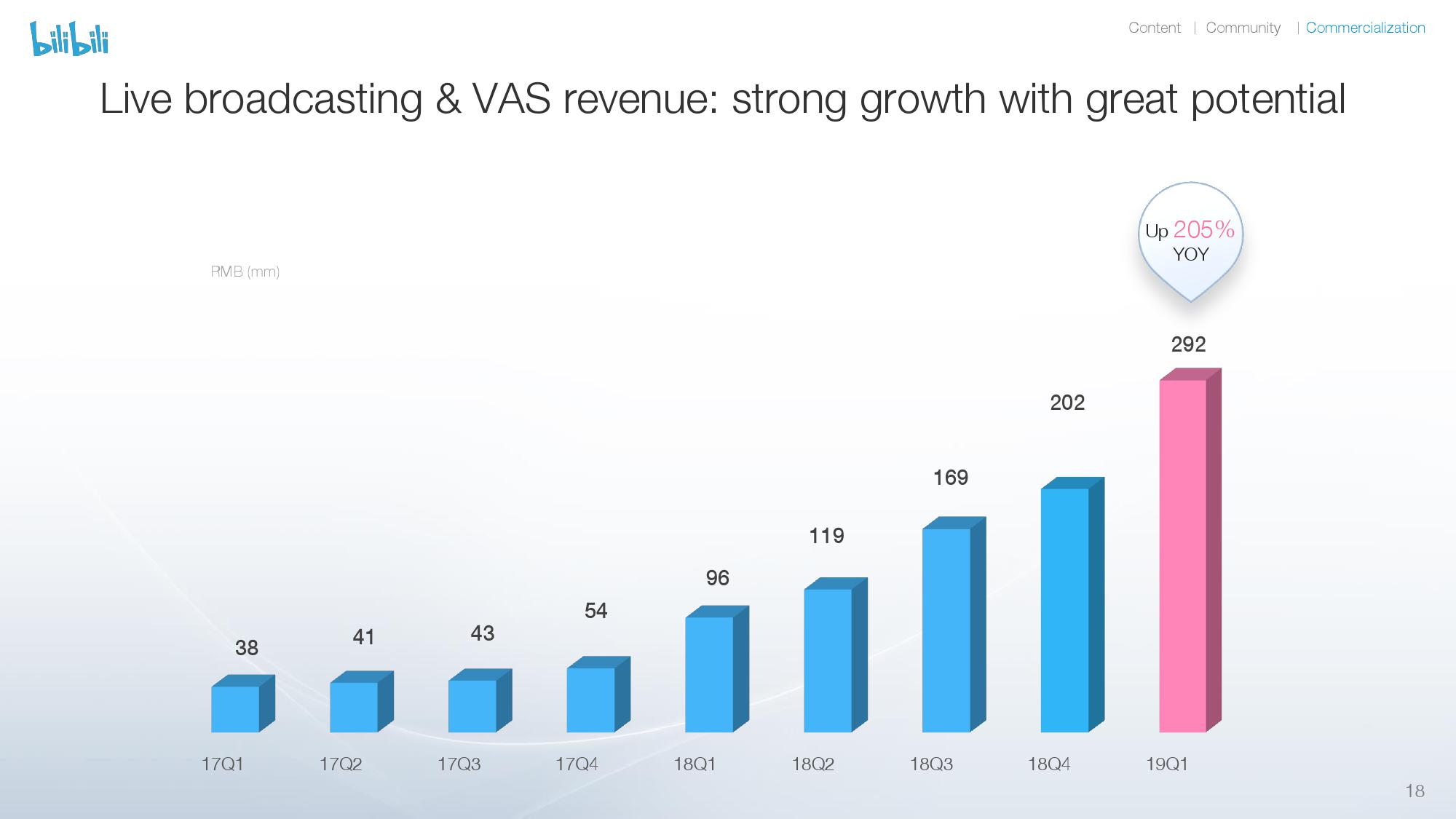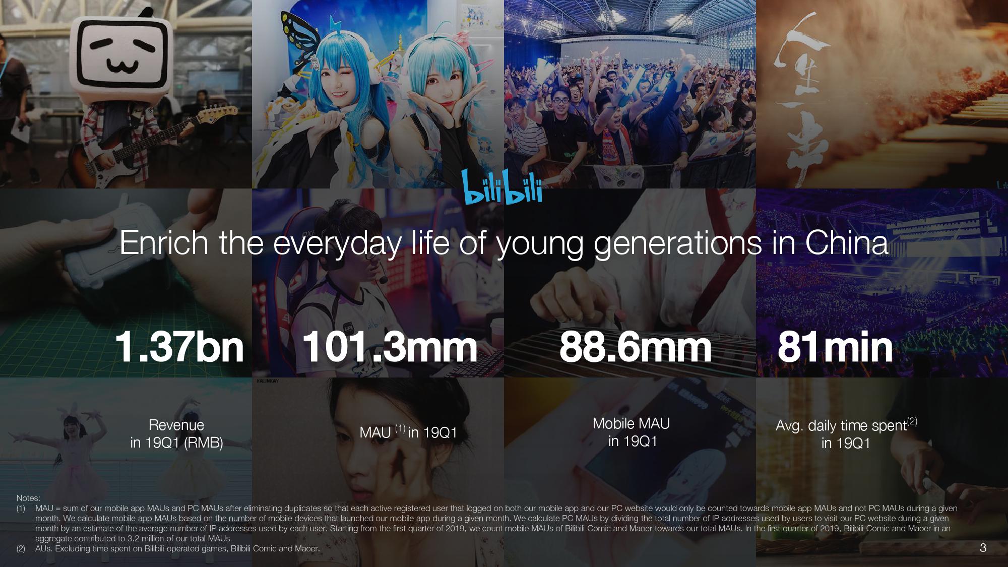 B站董事长兼首席执行官陈睿表示:“2019年第一季度,我们在用户和营收上双双实现了高速增长,以强劲的势头开启了新的一年。UP主创作的高质量内容以及直播、漫画等领域的优质内容,驱动我们的用户数量到达了一个全新的里程碑——不仅月活用户首度实现破亿,日活用户也突破3000万。展望未来,我们的关注点将长期落在用户增长与商业化能力的持续提升上,通过内容与技术的不断创新,推动社区活跃壮大。”