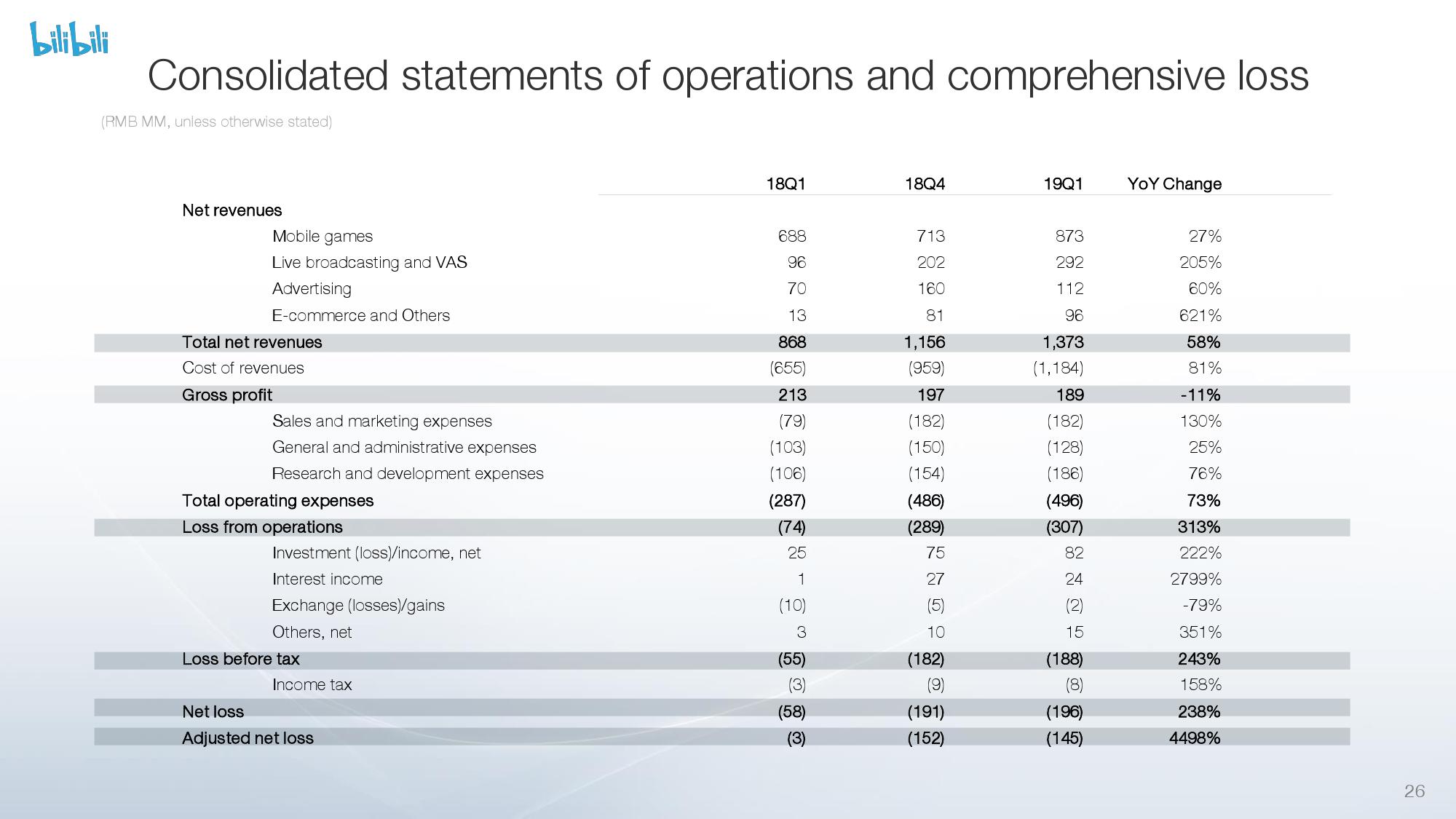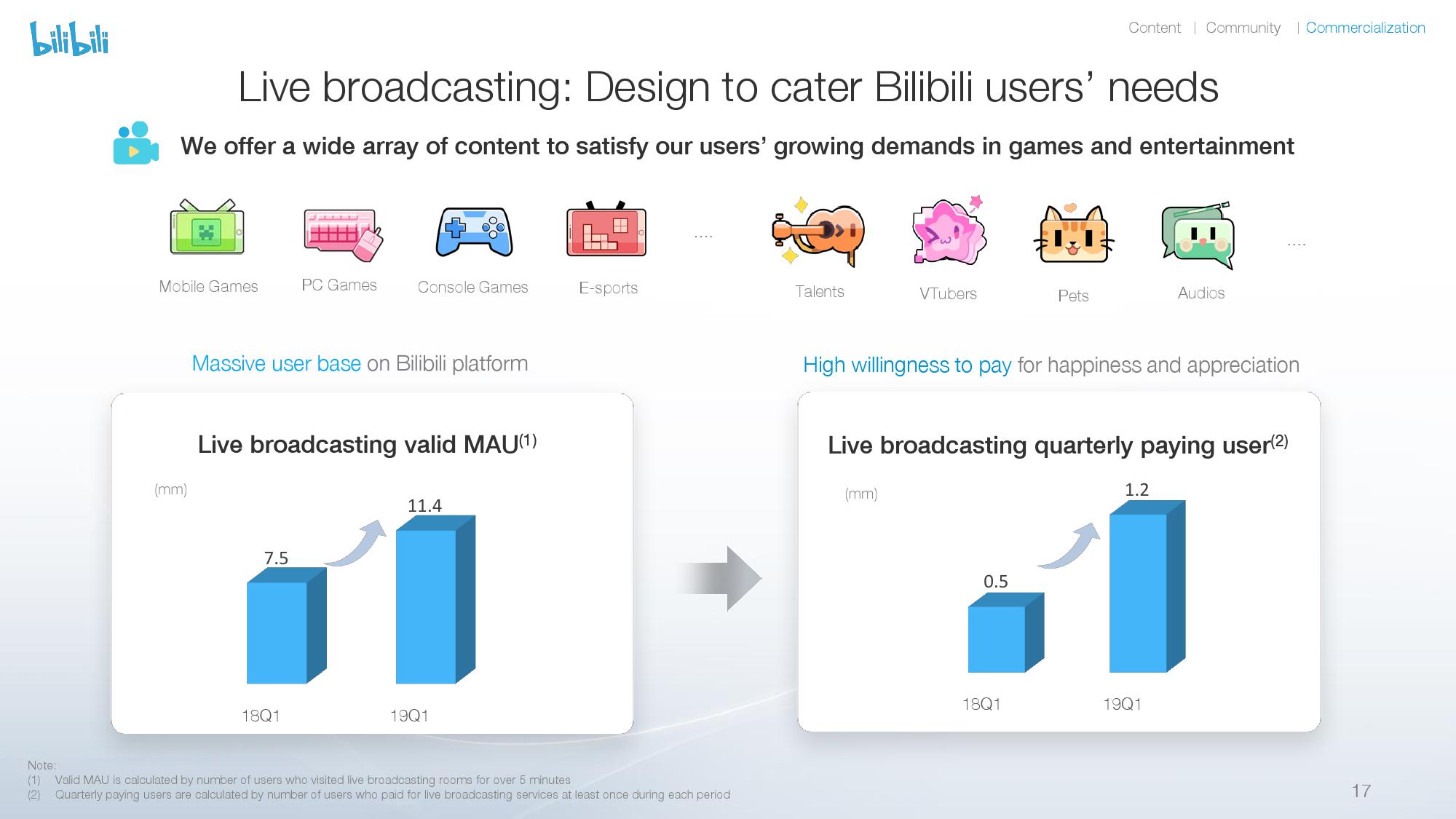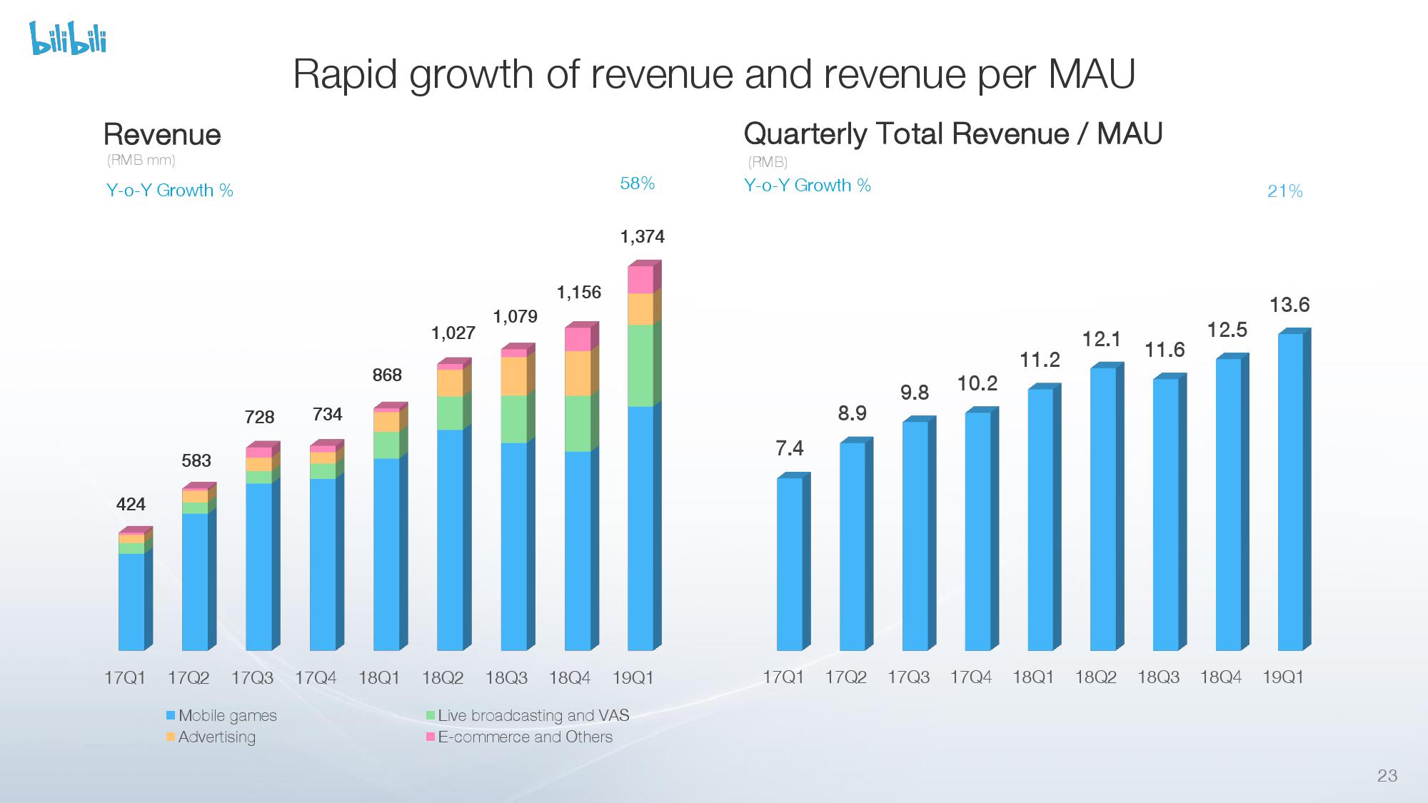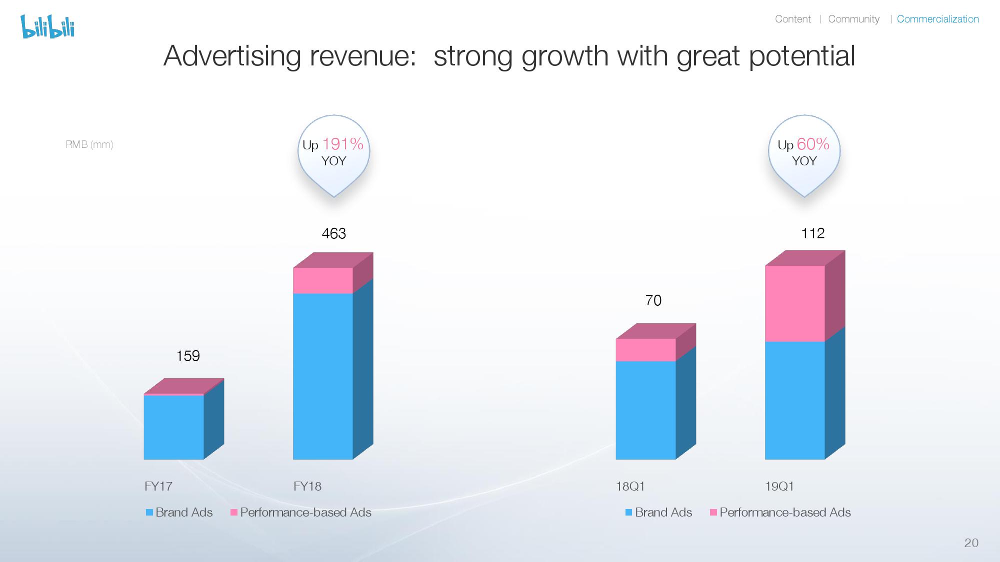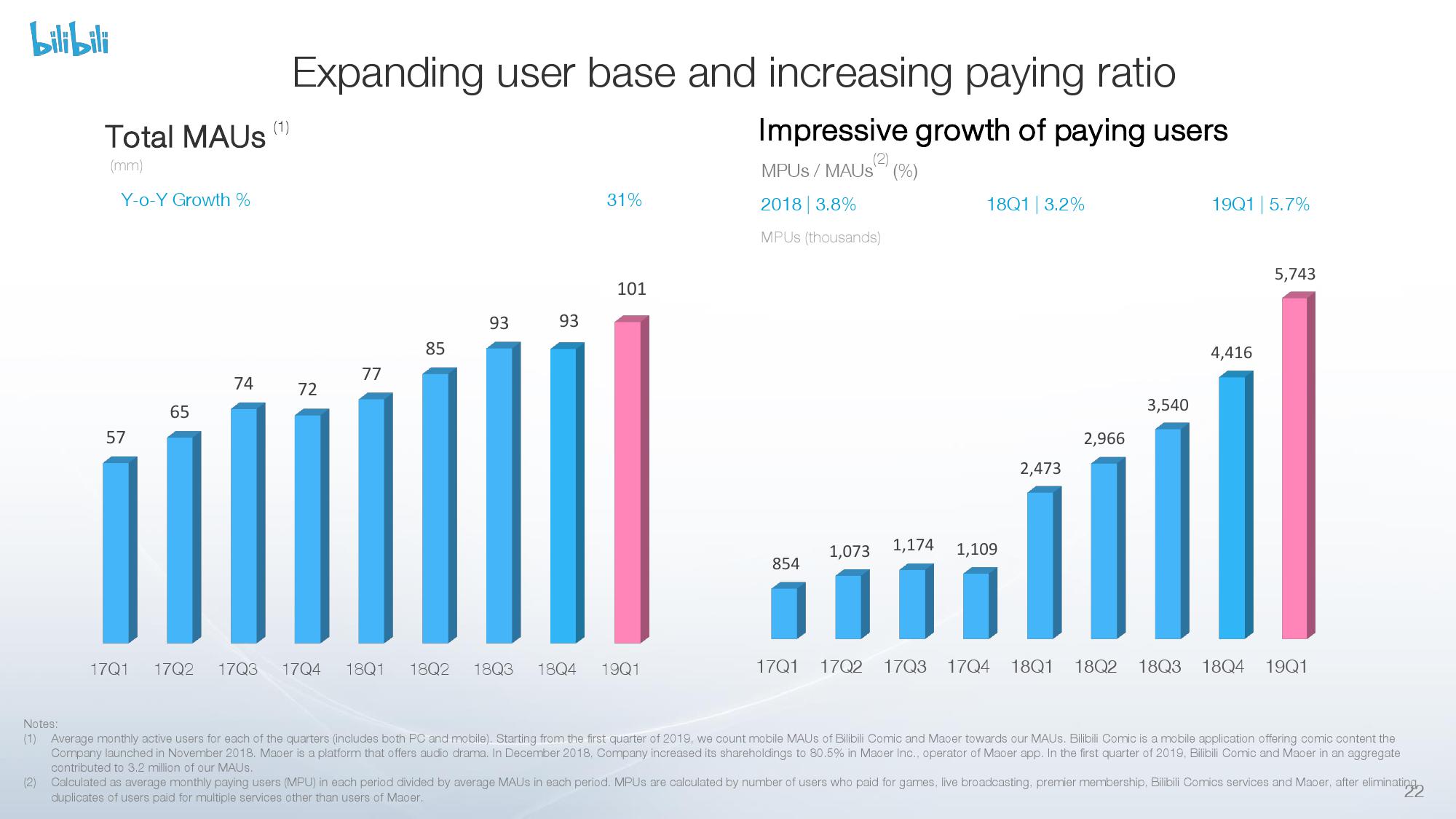 B站董事长兼首席执行官陈睿表示:“2019年第一季度,我们在用户和营收上双双实现了高速增长,以强劲的势头开启了新的一年。UP主创作的高质量内容以及直播、漫画等领域的优质内容,驱动我们的用户数量到达了一个全新的里程碑——不仅月活用户首度实现破亿,日活用户也突破3000万。展望未来,我们的关注点将长期落在用户增长与商业化能力的持续提升上,通过内容与技术的不断创新,推动社区活跃壮大。”