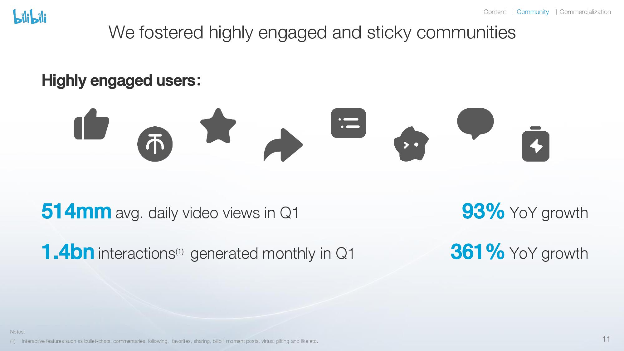 在新用户大幅增长的同时,B站社区生态持续繁荣,并且依旧在用户黏性和活跃度上获得显著提升。第一季度,用户日均使用时长同比增加5分钟至81分钟。日均视频播放量达到5.1亿次,月均互动数达14亿次,分别同比提升93%和361%。