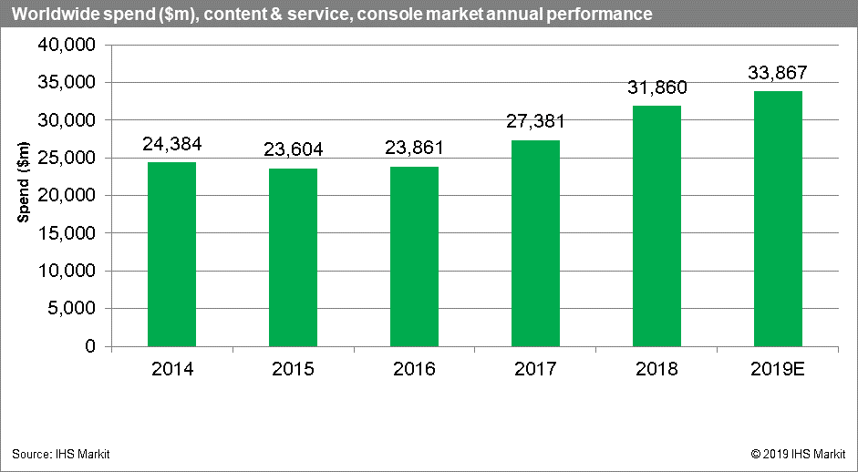 IHS Markit的数据显示,游戏主机市场状况良好,其内容和服务领域已从2017年的270亿美元增长到2018年的近320亿美元。实际上,2018年游戏主机市场(硬件支出以及内容和服务支出)总额为470亿美元,和2017年的420亿美元比有所增长,后者本身也处于2011年以来的最高水平。