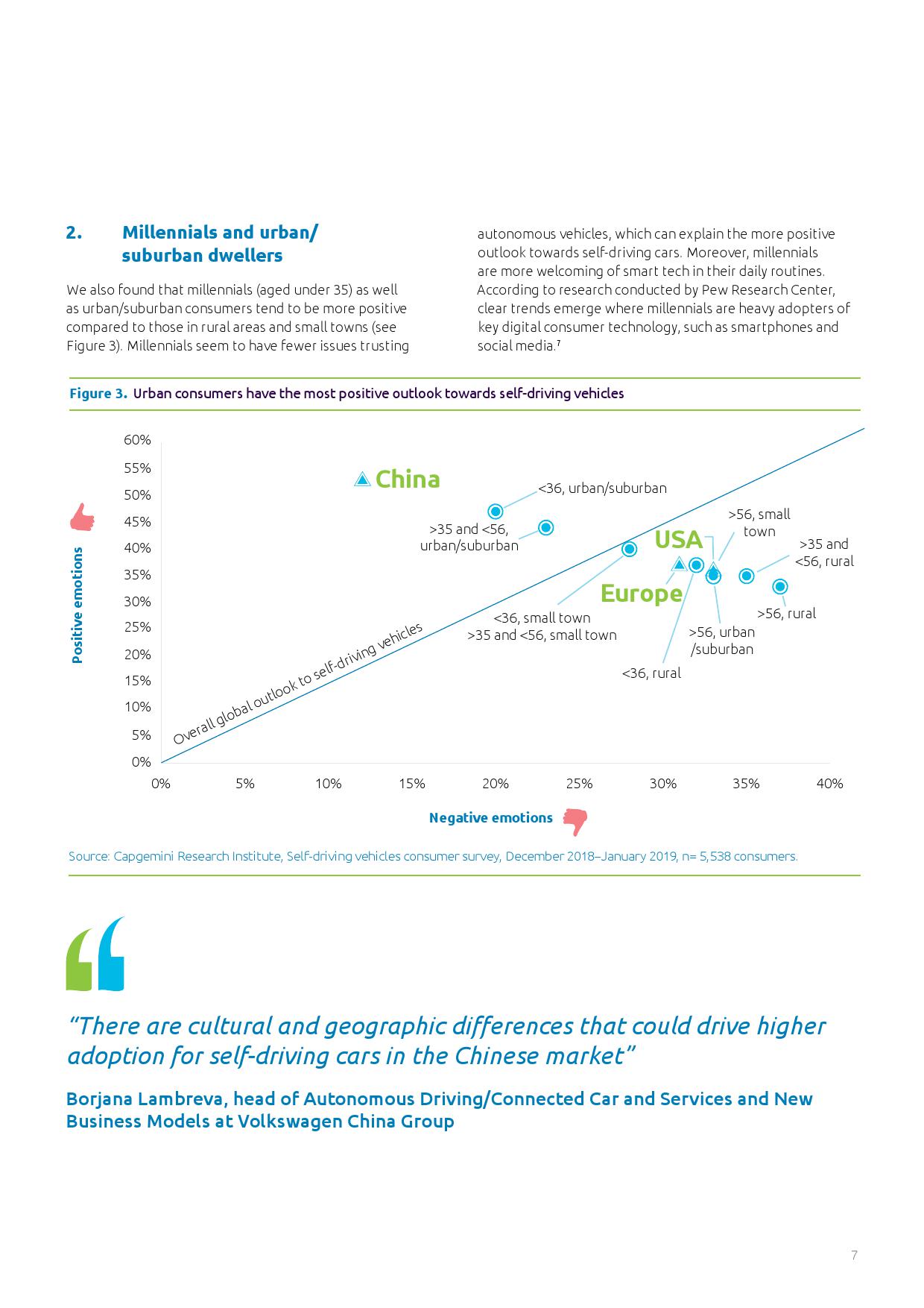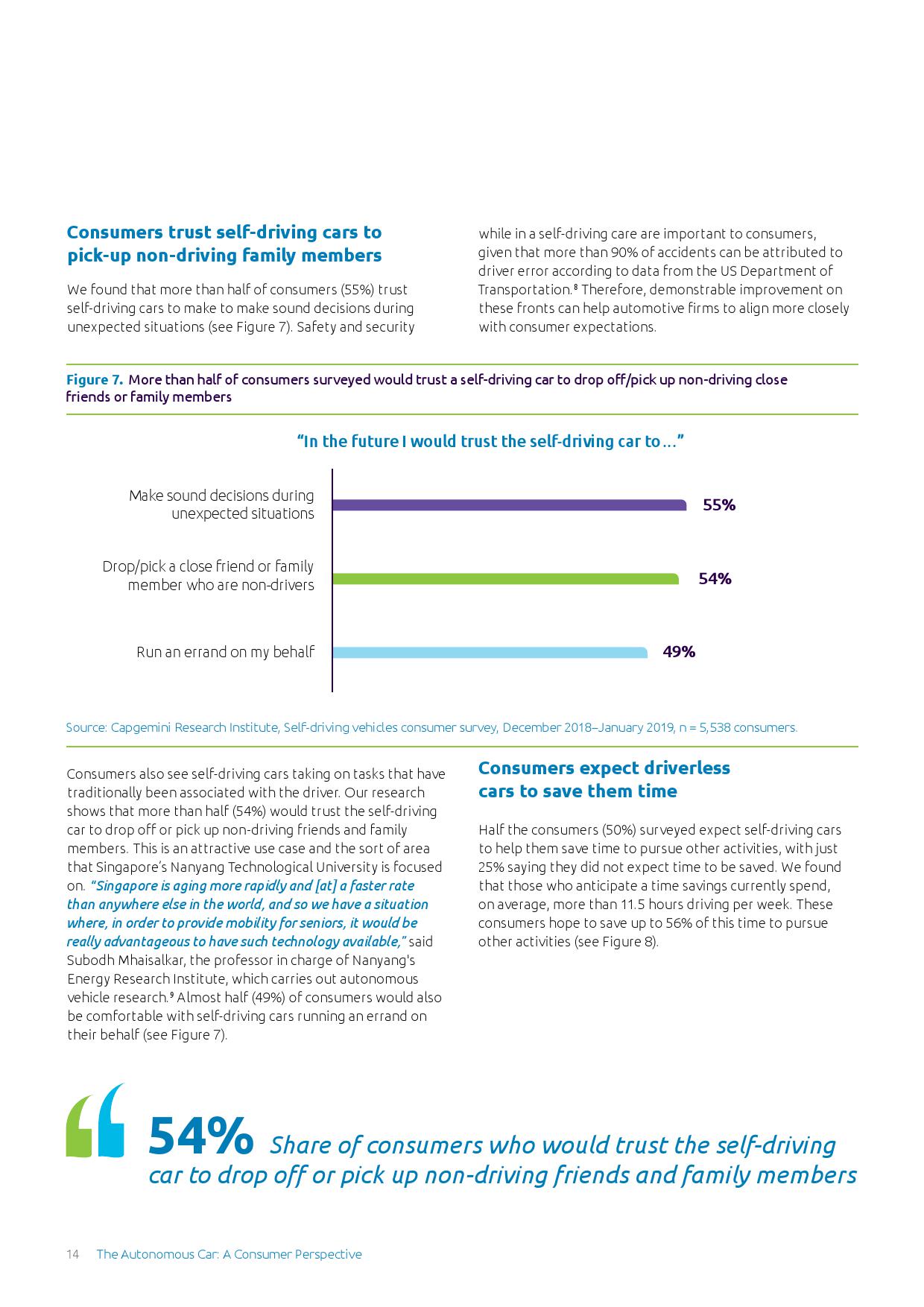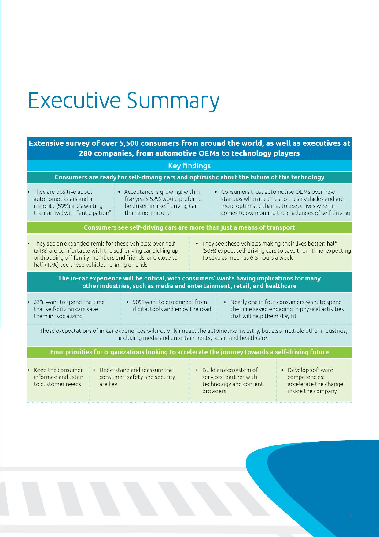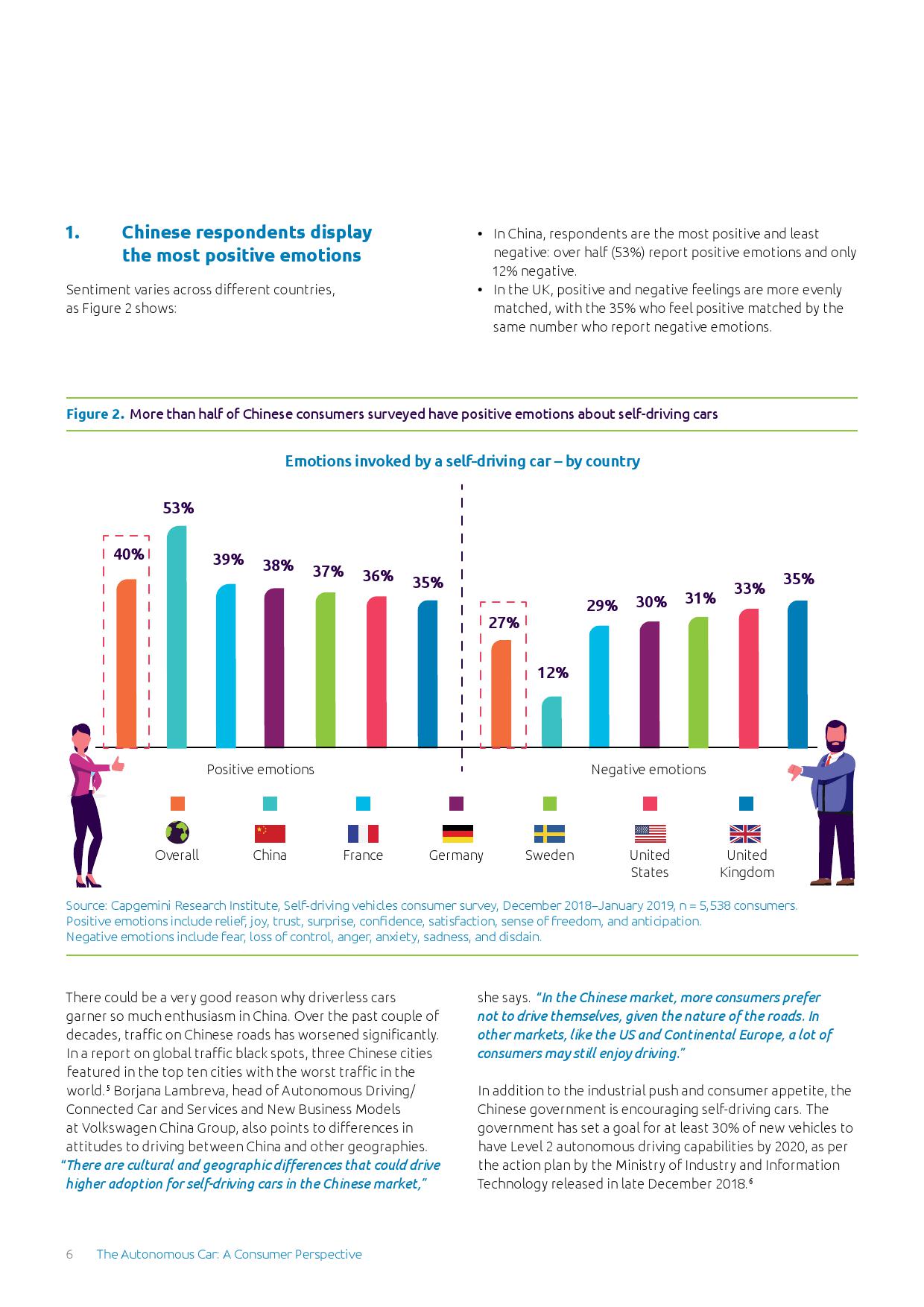 Capgemini全球汽车业务负责人 Markus Winkler :”我们的报告显示,潜在自动化驾驶汽车用户对这一产品持有非常乐观和兴奋的态度。到目前为止,多数讨论都集中在无人驾驶汽车的技术发展上。因此乘客们看到该技术带来的潜在好处,并产生共鸣。这极大地鼓舞了我们。客户对车内体验的期望不仅影响汽车行业,还会影响媒体、娱乐、零售、医疗等其他行业,从而为大量的行业协作业务机会铺平道路。不过,目前仍然存在一定的不确定性和担忧。汽车厂商在市场推广自动化驾驶汽车时,必须考虑到未来客户的期望和担忧,同时将自己的业务从产品导向转为服务和客户导向。”