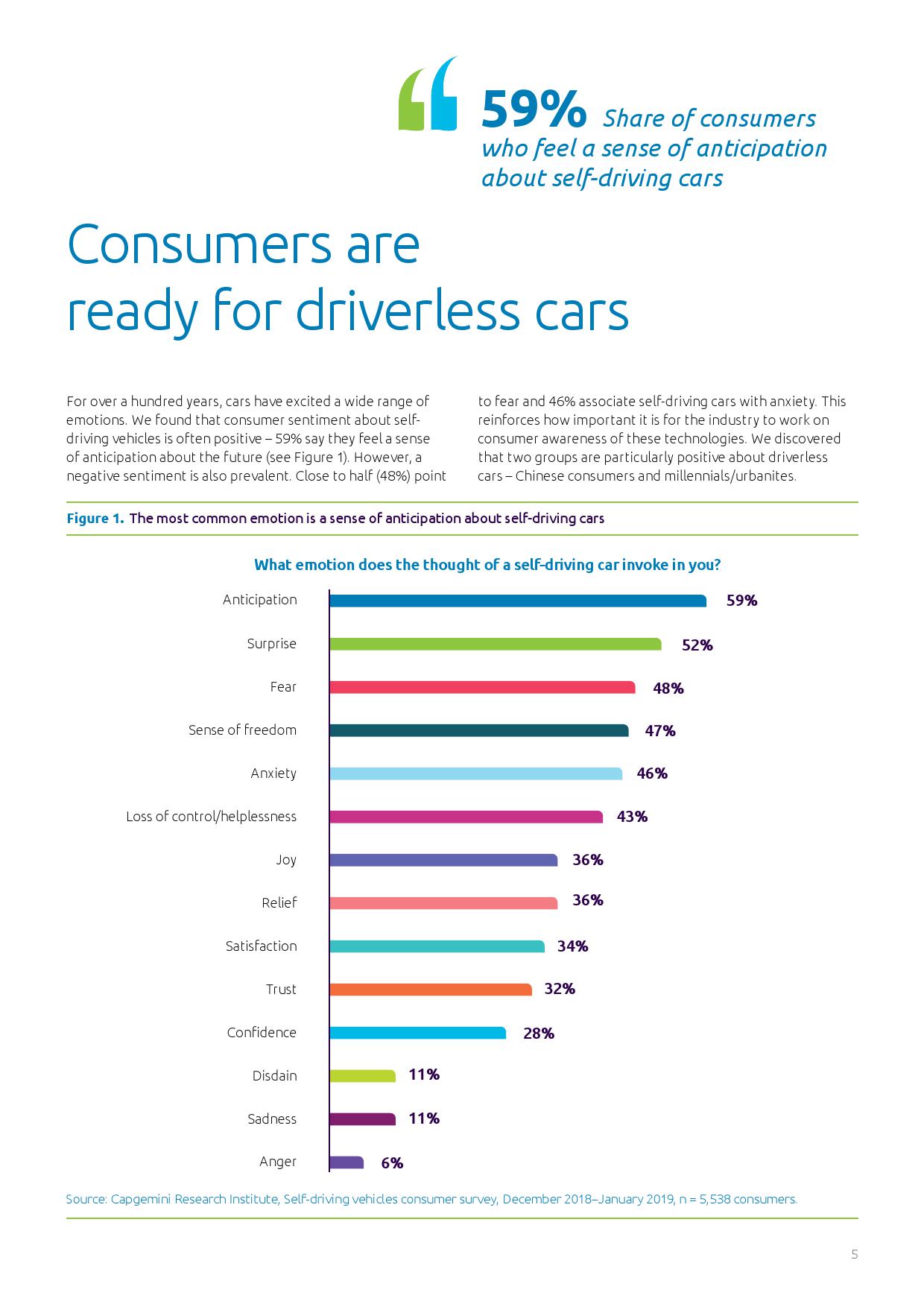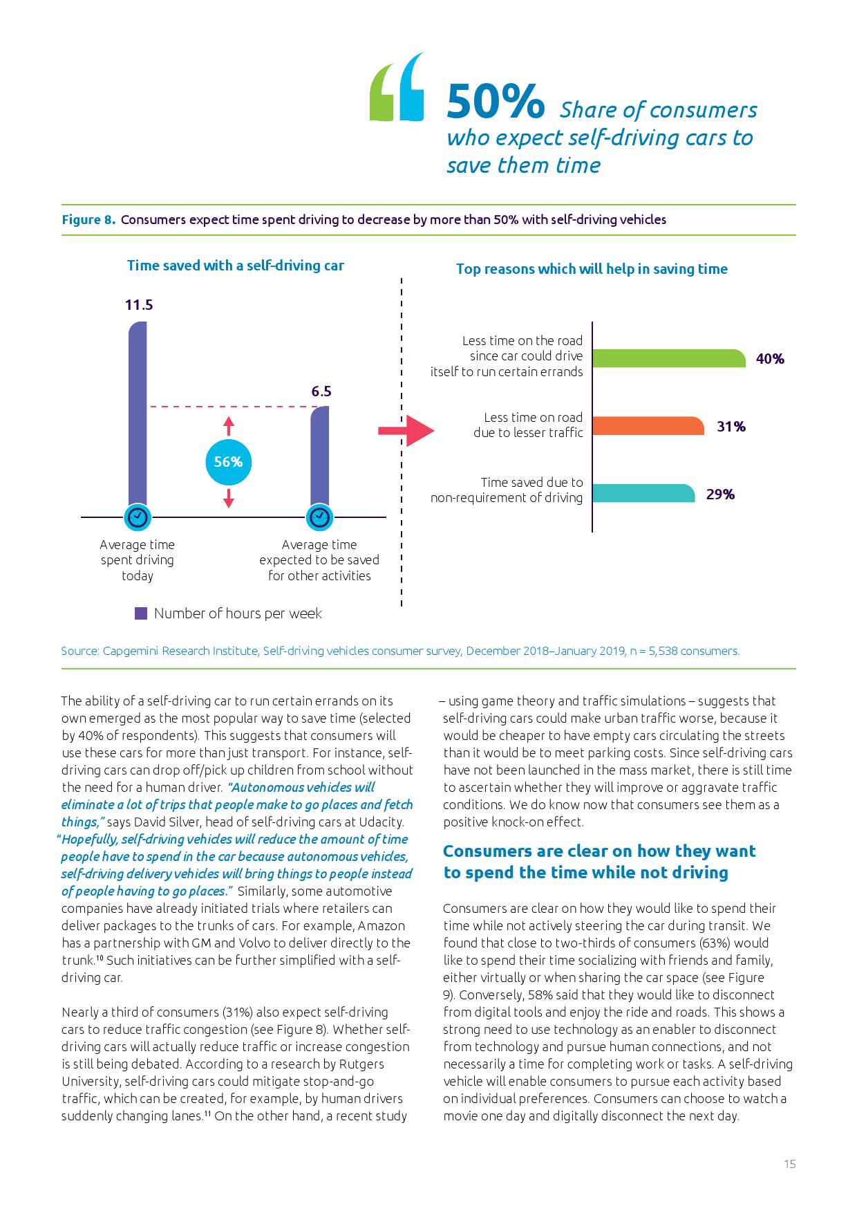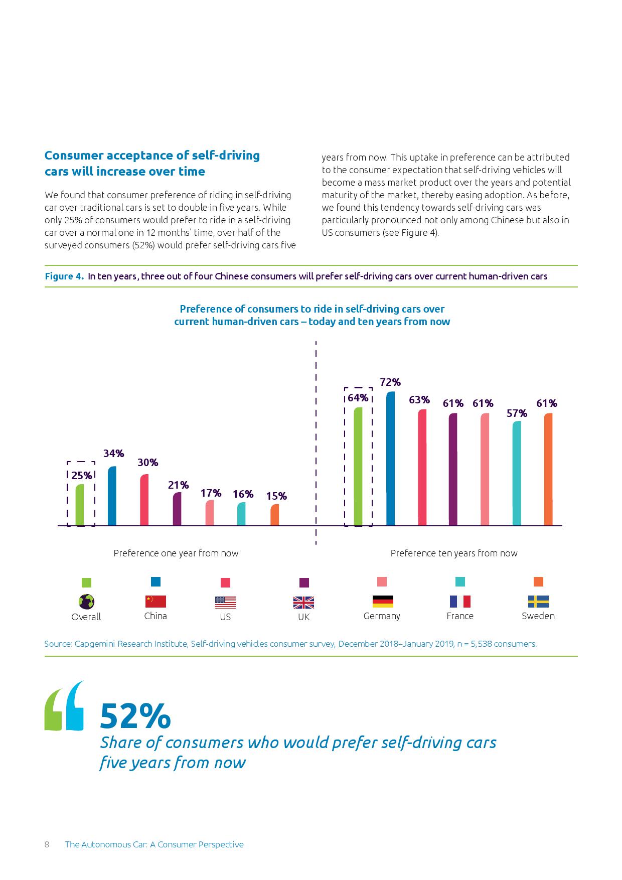 Capgemini最新报告发现在未来五年内,消费者对于自动化驾驶的需求将会翻一番。在未来一年内,虽然仅25%的消费者选择购买自动化驾驶汽车,但近52%的人群表示到2024年他们将会选择购买自动化驾驶汽车作为出行工具。