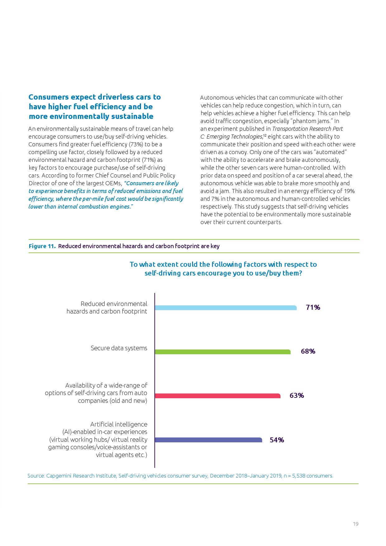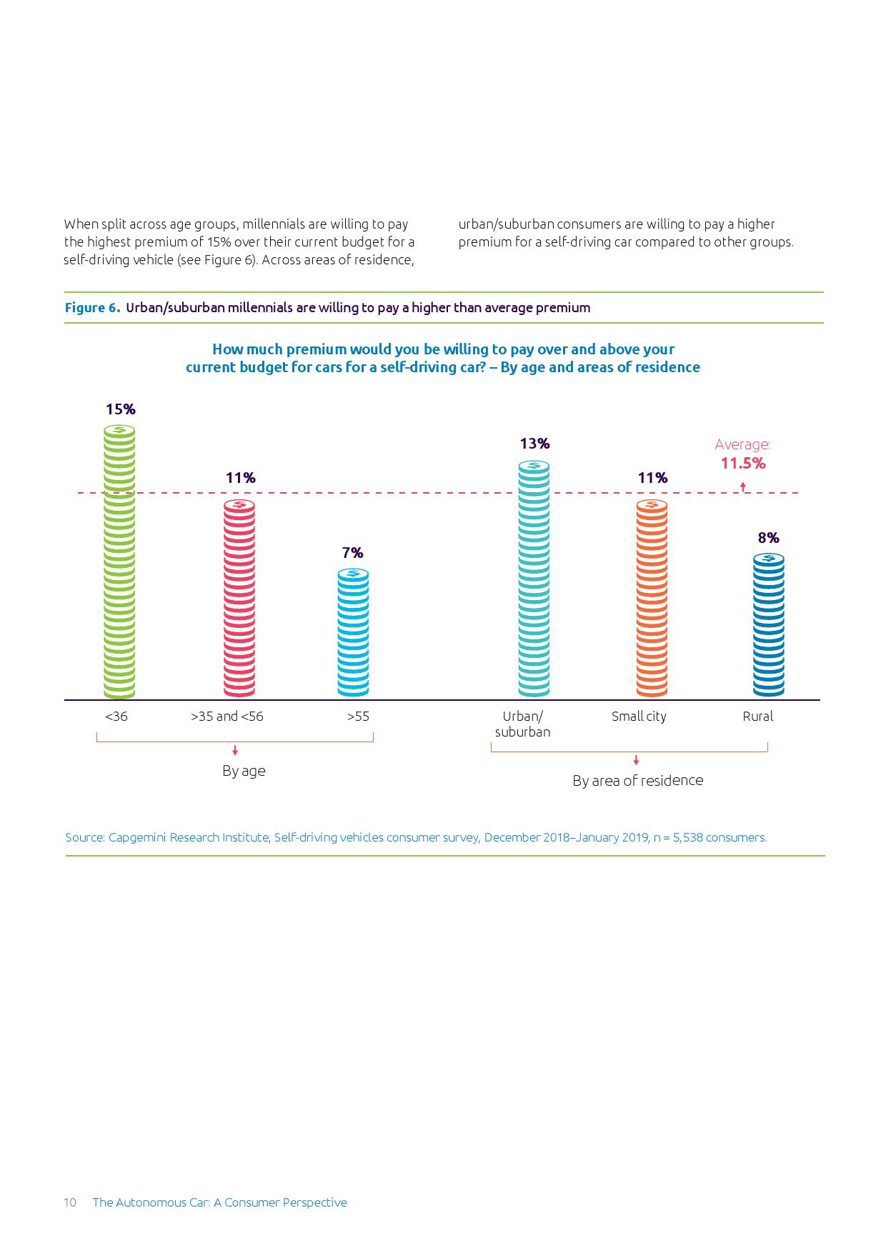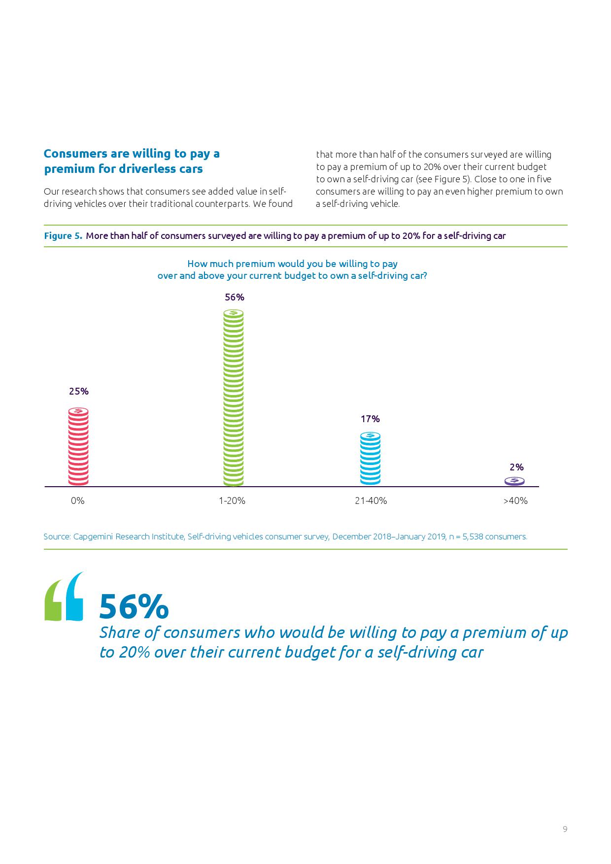 消费者的积极态度显示,他们认为自动化汽车在燃油经济性(73%)、减少排放(71%)以及节约时间(50%)上有巨大优势。在如此乐观的态度和期待之下,逾半数(56%)消费者表示,比起普通汽车,他们愿意为自动化汽车多花20%的开支。