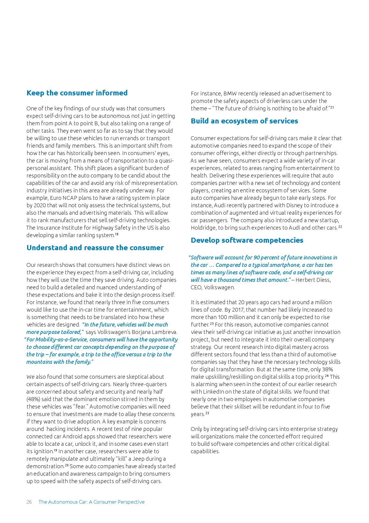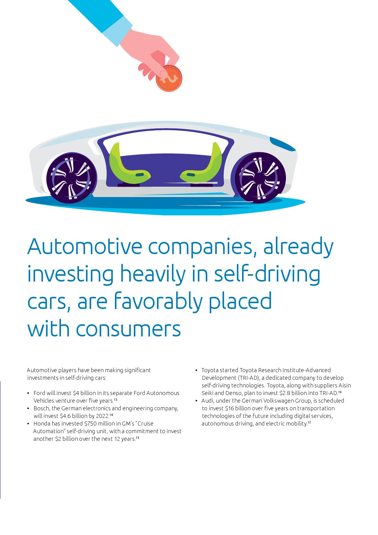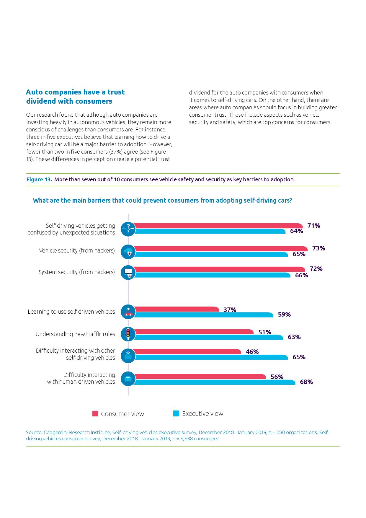 理解其顾虑并使客户放心:研究显示消费者很明确他们对于无人驾驶汽车的期望。汽车厂商应充分理解消费者的期望,并将其融入到设计中,同时为汽车安全进行投资,并将其传达给消费者。
