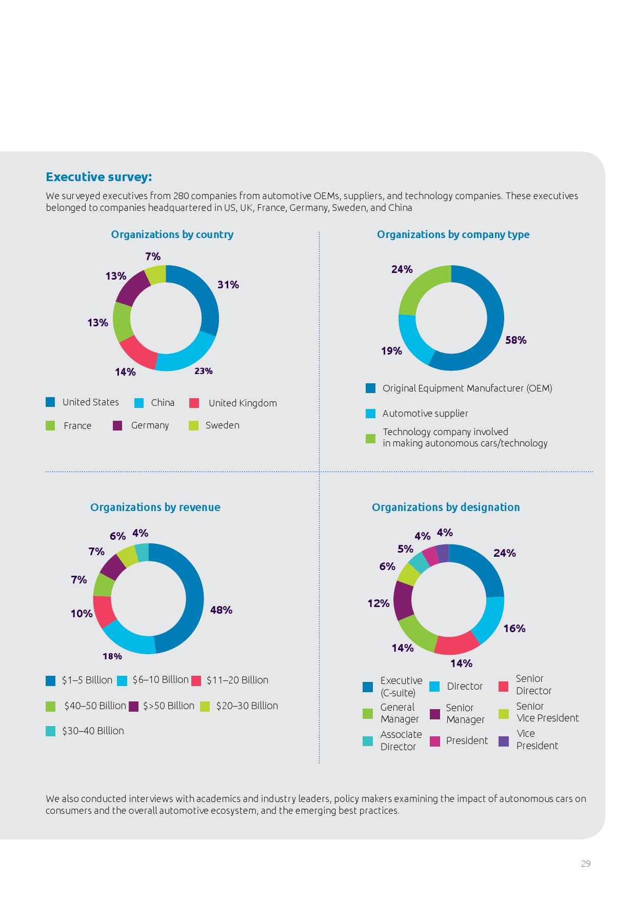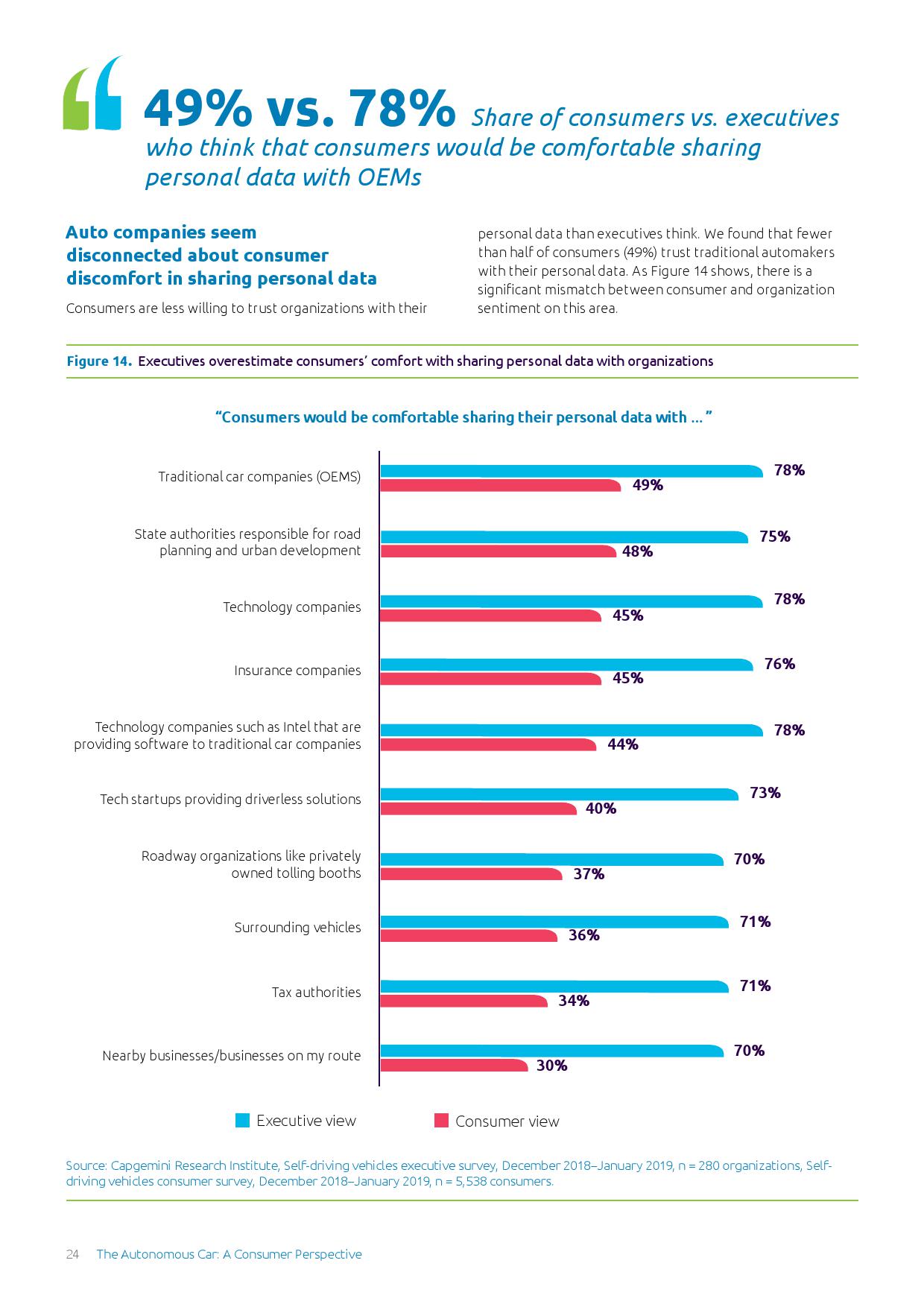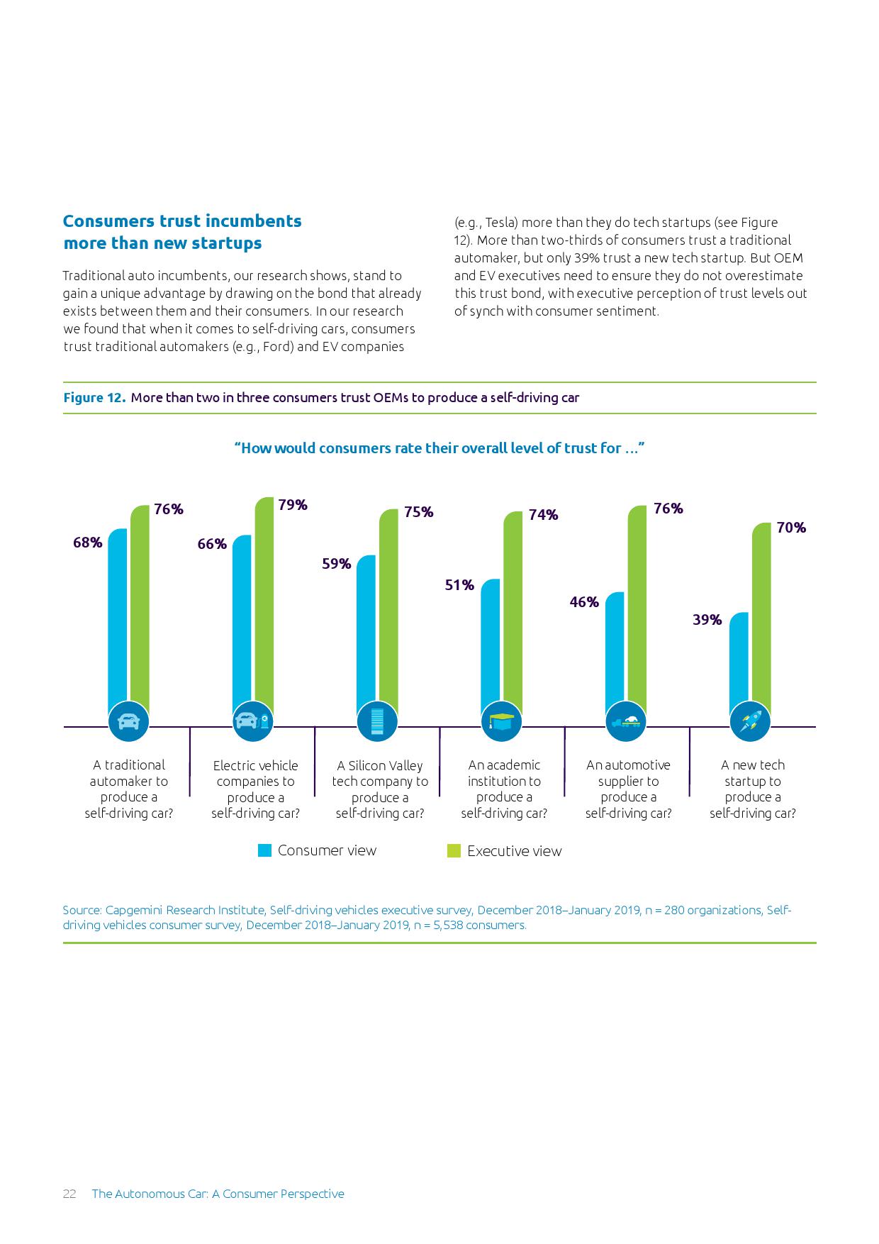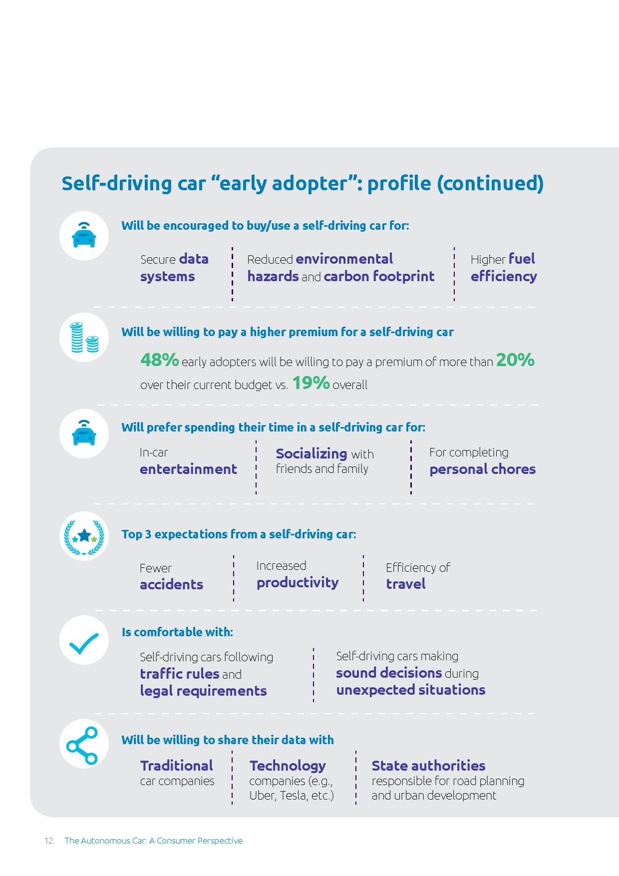 理解其顾虑并使客户放心:研究显示消费者很明确他们对于无人驾驶汽车的期望。汽车厂商应充分理解消费者的期望,并将其融入到设计中,同时为汽车安全进行投资,并将其传达给消费者。