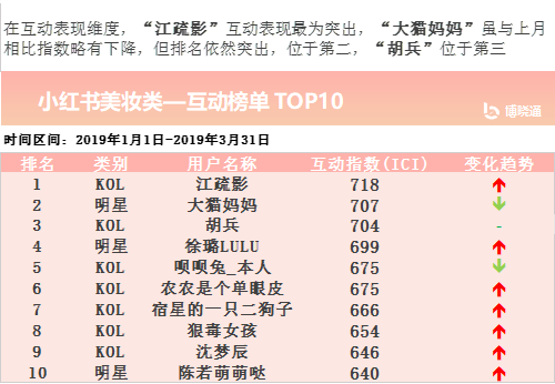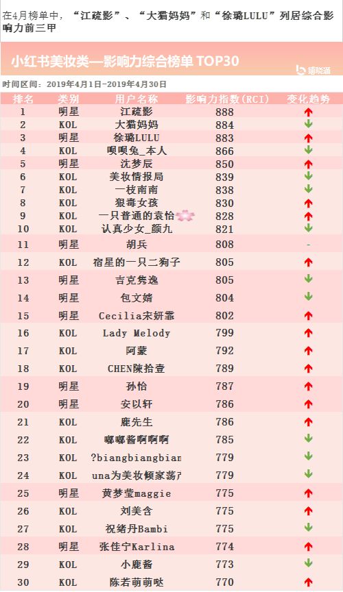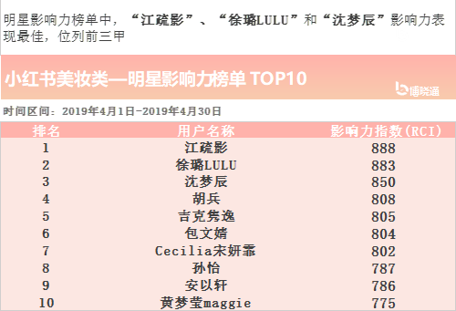 在4月影响力综合榜单中美妆类明星-“江疏影”、“徐璐LULU”、“沈梦辰”表现最为突出,抢占TOP5坐席。