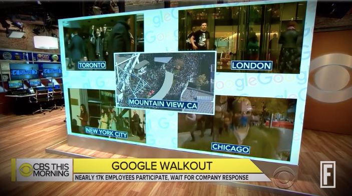 当地时间上午11点10分,100名员工走出谷歌办公室。13个小时后,该公司纽约总部的电梯里挤满了人,以至于员工们要走楼梯下楼,到街上抗议。作为抗议游行的一部分,在奥斯汀,谷歌员工为性侵犯受害者默哀了两分钟。在旧金山,数百名员工聚集在历史悠久的渡轮大厦对面,高呼“Time’s Up at Google”,并举着“工人的权利就是妇女的权利”、“免费食物≠安全空间”等标语。