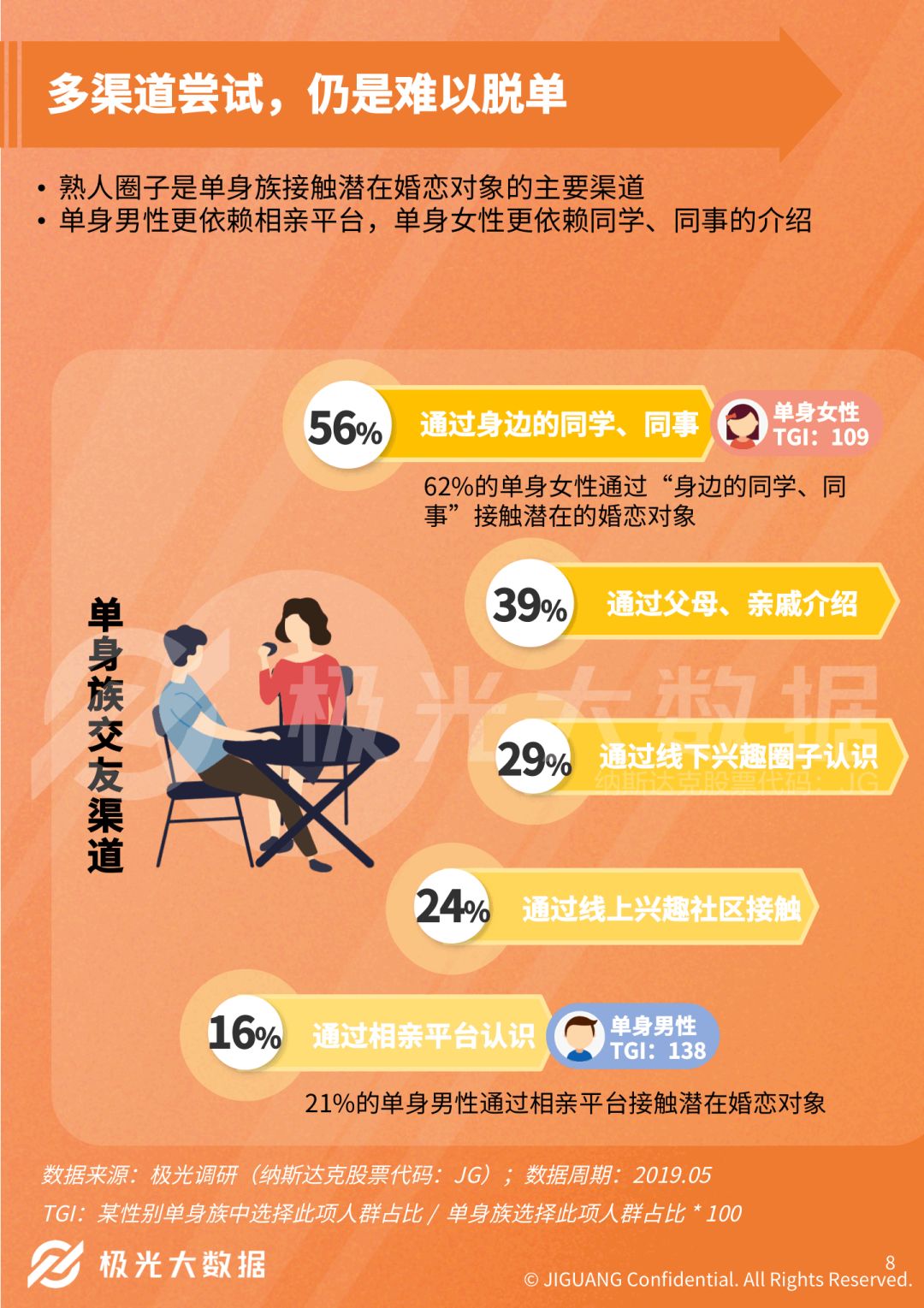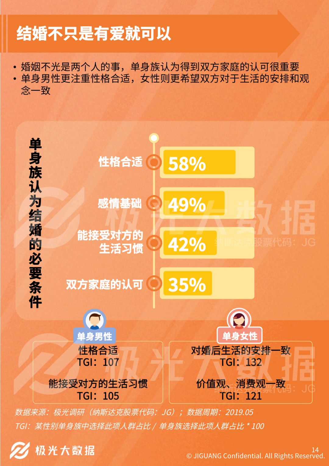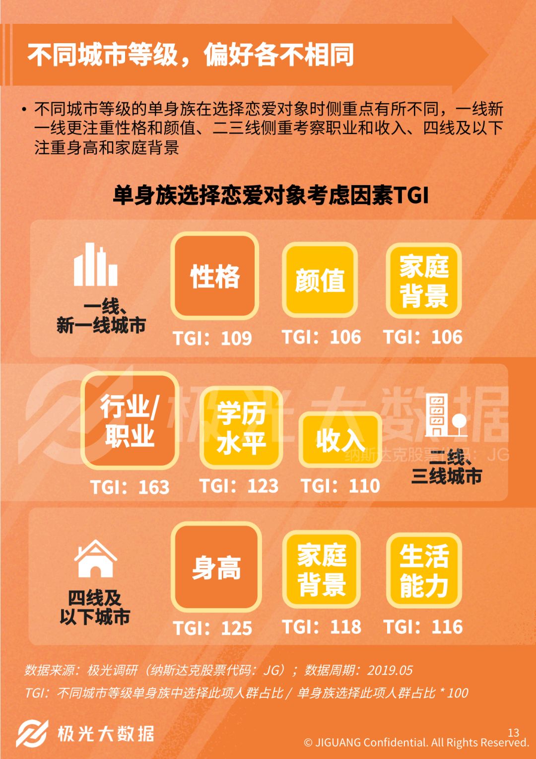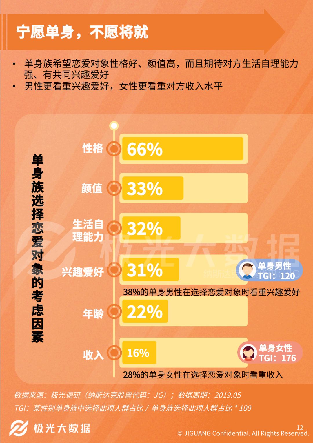 - 宁愿单身,不愿将就。单身族期待对方性格好、颜值高,二三线城市单身族更看重对方职业和收入水平