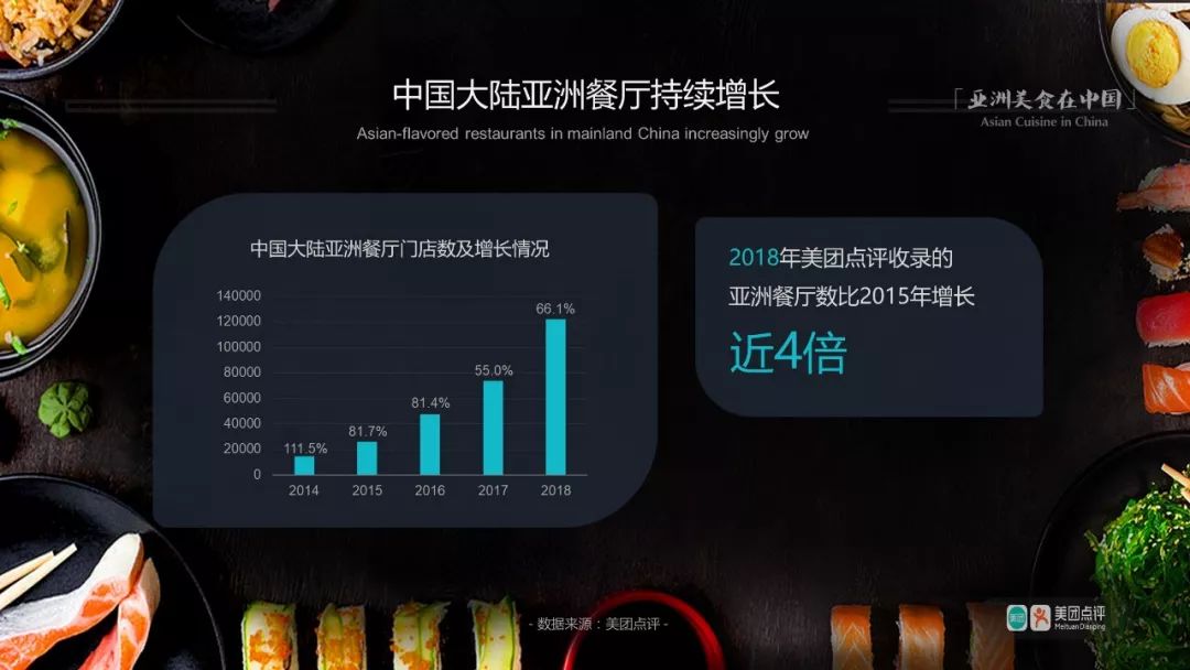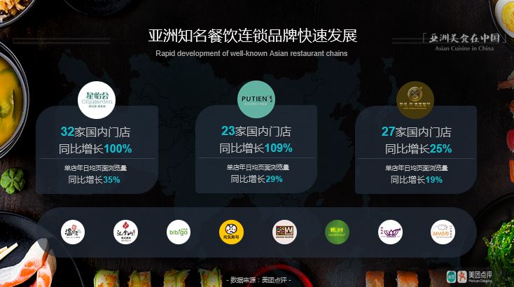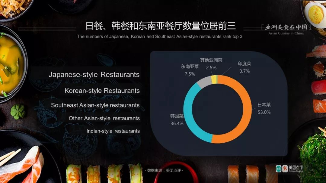在广州,亚洲餐厅共4229家,其中日本餐厅2716家、韩国餐厅909家、泰国餐厅167家,排名前三;马来西亚餐、泰餐、日餐分别以96.6%、87.6%、81.4%的年增长率位列门店数增长最快前三;而用户浏览量增速最快Top3菜系则分别为土耳其餐(163.0%)、韩餐(46.2%)、日餐(30.2%)。