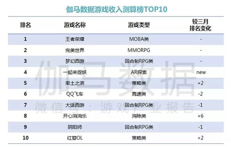 2019年4月,伽马数据测算榜TOP10中,《王者荣耀》继续居首,《完美世界》排名第二。前十中,腾讯占五款,网易占据四款,头部市场“两强”格局依然保持不变。同时,4月正式上线(公测)的AR探索游戏《一起来捉妖》凭借着新颖的玩法位居第六名,成为前十游戏中唯一一个新面孔。