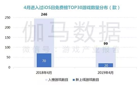 近日,权威的数字娱乐研究机构伽马数据发布了《2019年4月移动游戏报告(内部版)》。报告称:2019年4月,进入过iOS免费榜TOP30的产品共99款,较去年同期的246款下降59.8%。同时,移动游戏市场“新游荒”依然未能缓解,4月新上线入榜游戏为20款,占比20.2%,去年同期为70款,占比28.5%。