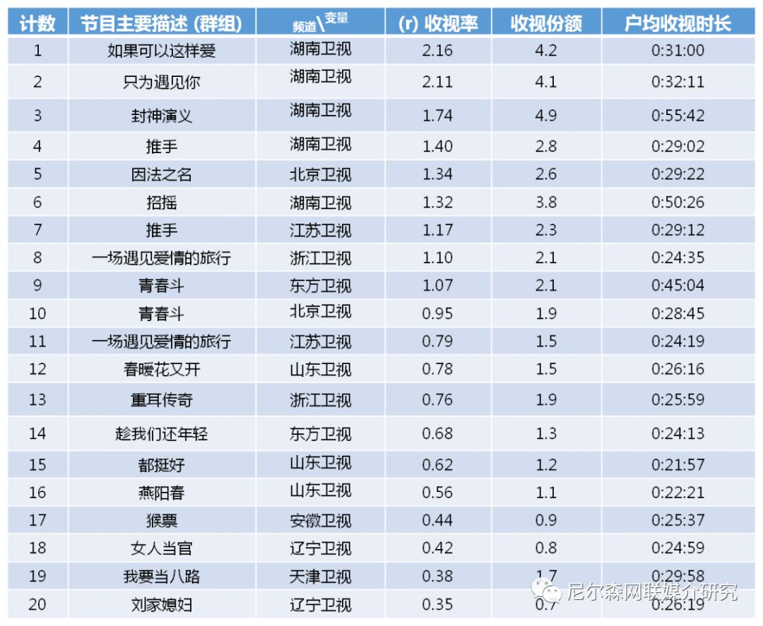 4月电视剧市场虽未出现“爆款”级电视剧,但收视排名靠前的《如果可以这样爱》和《一场遇见爱情旅行》都在网络上有较高的话题度。本月剧集的题材相较于上月则更为丰富,既有湖南卫视《只为遇见你》这样讲述都市情感的,也有东方卫视和北京卫视联播的《青春斗》这般描绘青春爱情,同时《封神演义》带观众重温古典奇幻,而北京卫视播出的《因法之名》深入现代法制。除此以外,古装励志剧《燕阳春》和《重耳传奇》以及着眼抗日战争的《我要当八路》均进入了电视剧排名TOP20。