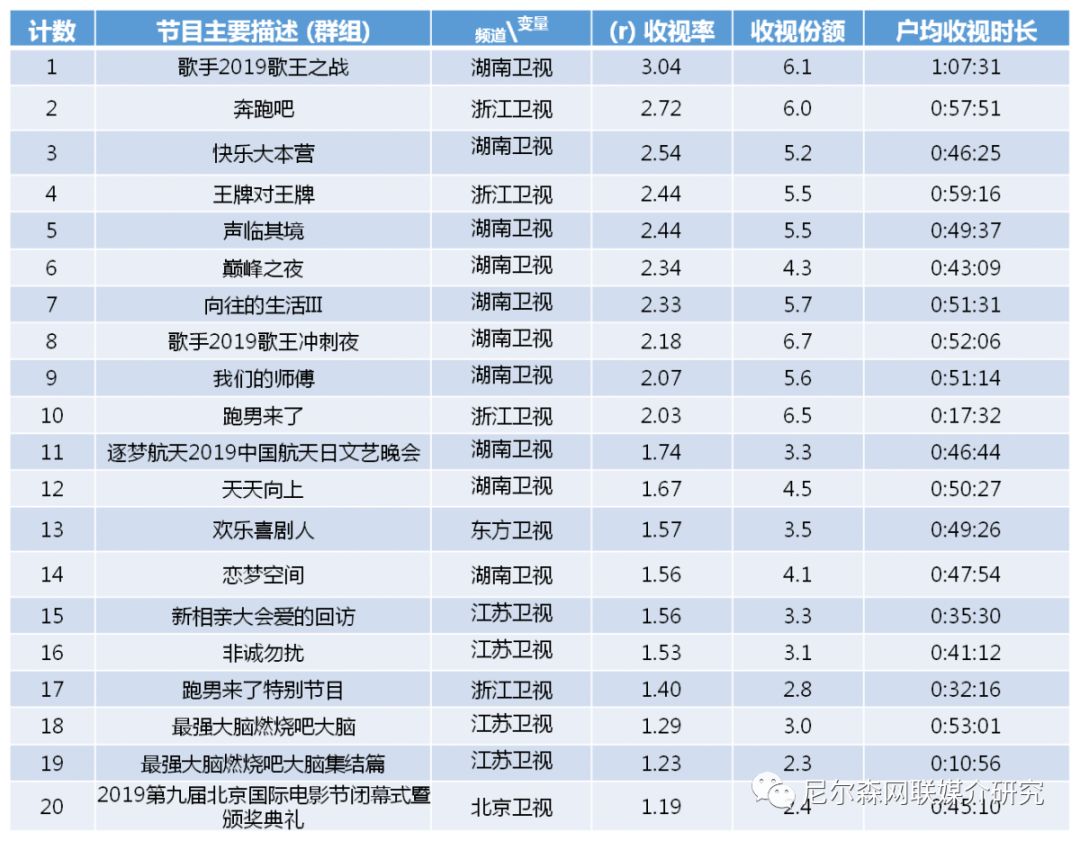 2019年第二季度已经展开,各大卫视将会呈现怎样百花齐放的收视局面,能给观众带来哪些集品质与趣味于一身的剧集和综艺节目呢?下一个充满话题性的“爆款”节目将在哪里诞生?尼尔森网联尼尔森网联海量融源收视率(全国网)将与您一同期待5月的精彩。