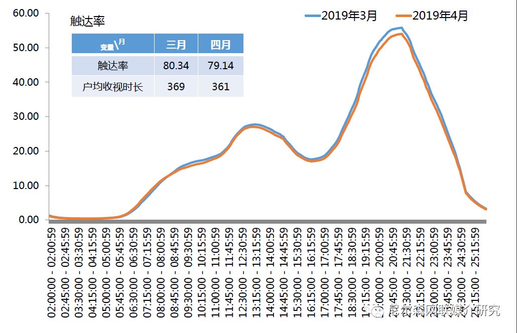 4月整体电视市场受到季节变化的影响出现小幅波动。分时段来看,相较于3月,白天时段的触达没有太大变化,而晚间黄金时段的触达率有较为明显的下降。全天来看,整体呈稍微下降态势但依然保持在高位,与往年同期波动类似,分钟触达曲线与上月相近。户均时长本月基本维持稳定。