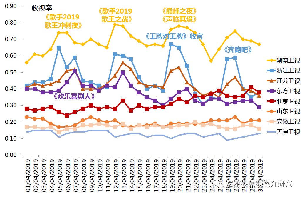TOP10卫视4月分日收视情况更直观地展现了究竟哪些节目带动着频道收视。湖南卫视在剧集广受欢迎的同时,《歌手》决战、《声临其境》、《巅峰之夜》等超人气综艺为其带来本月的几次收视高峰。浙江卫视的收视亮点主要来源于《王牌对王牌》的贡献和重新回归的《奔跑吧》,江苏卫视则依靠于《非诚勿扰》类相亲节目的忠实观众群。除TOP3卫视外,东方卫视的老牌喜剧节目《欢乐喜剧人》表现稳定,北京卫视本月下旬播出的电视剧《因法之名》收视逐渐走高。虽然4月晚间湖南卫视仍旧延续已有优势,但各大卫视都为观众提供了精彩纷呈的节目,丰富了人们的休闲娱乐时间。