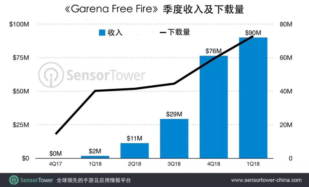 正如Sensor Tower近期的文章指出,2017年底上市的《Garena Free Fire》已成为全球收入最高的五大“战术竞技”手游之一。Sensor Tower 商店情报数据显示,2019年Q1该游戏全球App Store 和Google Play收入和新增玩家均创下季度历史新高,分别达到9000万美元,和7300万新增。
