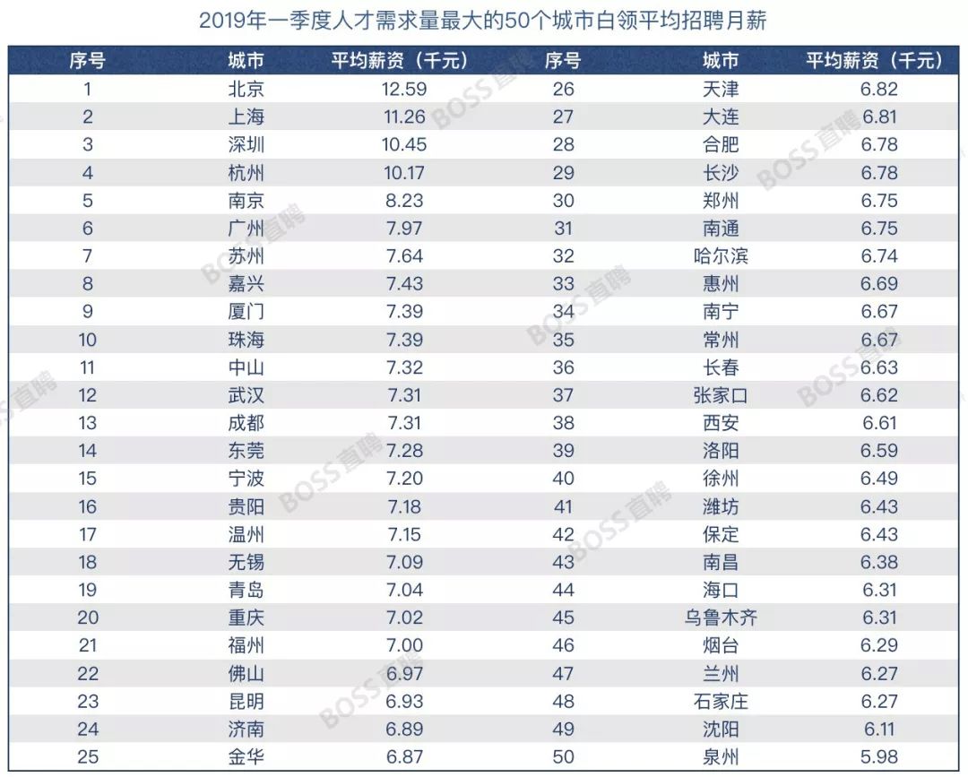 确实如此。在BOSS直聘发布的2019年Q1人才吸引力报告中,我们也可以看到:除了北上深杭均薪过万外,此外最高薪资的只有8.23K。