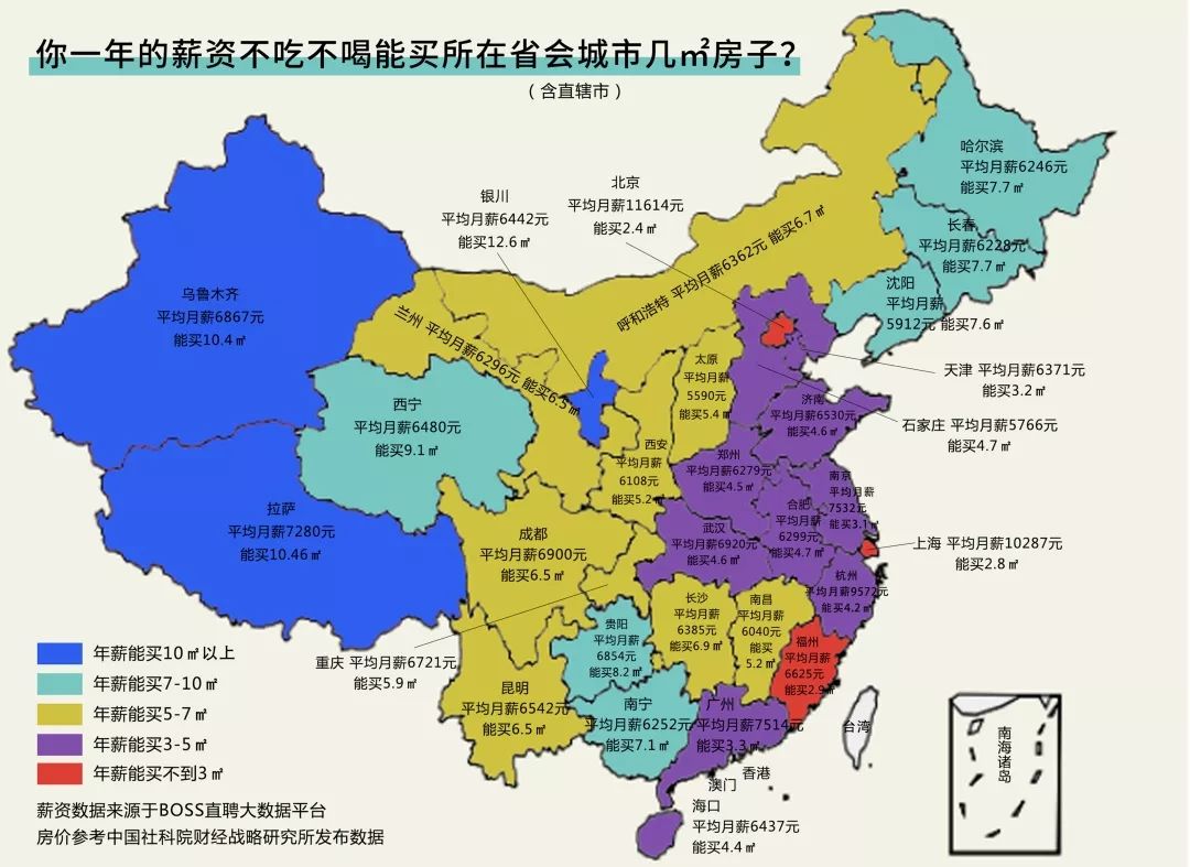 在BOSS直聘发布的《2018年年薪买房平米数榜单》中,在北京上海勒紧裤腰带,不吃不喝一年的薪资都买不了3平米的房子,市中心半平米都买不起,而在其他城市,房价压力则要小很多,比如在成都,年薪能买6.39平,在武汉也能买近5平。