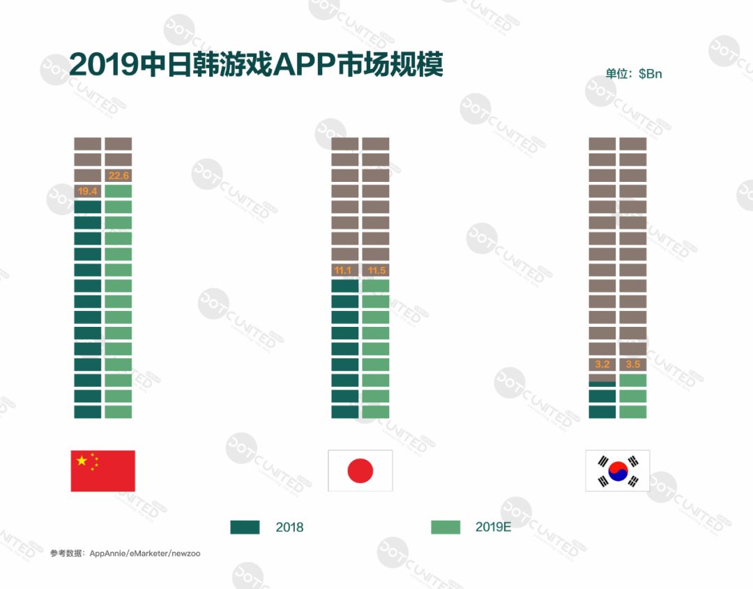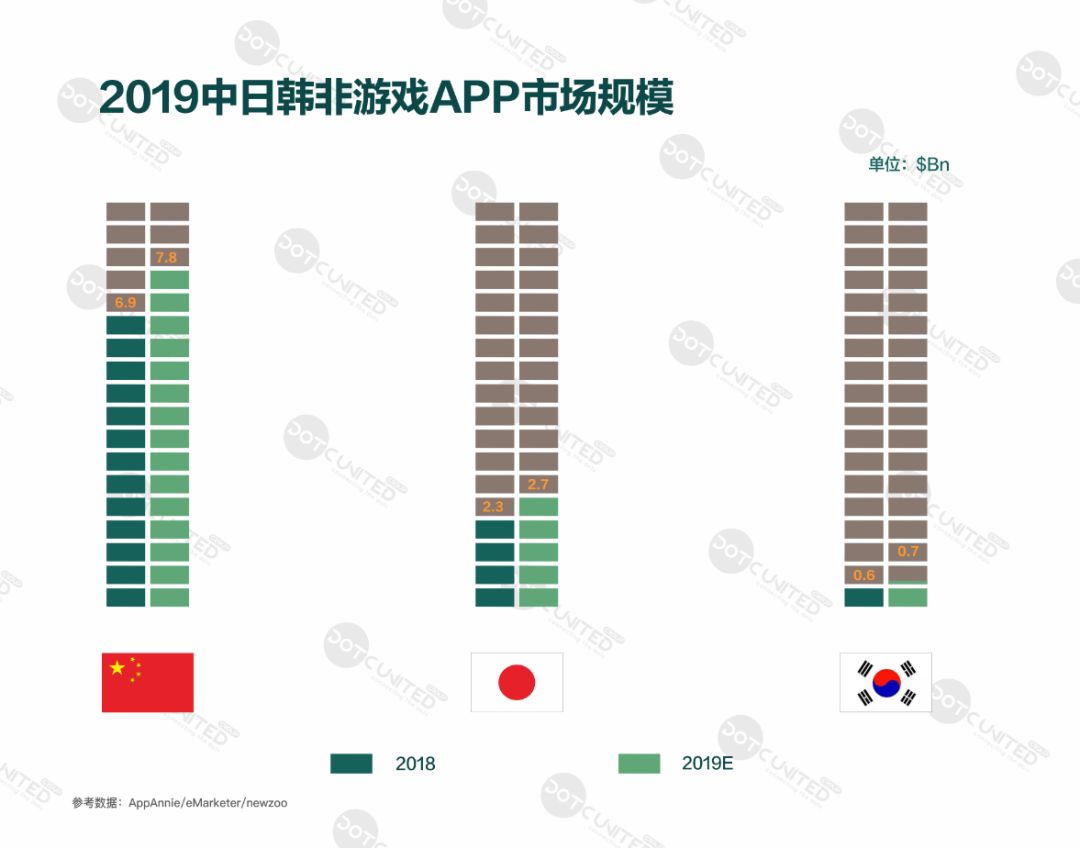 有数据显示,2019 年中国 APP(包括游戏和非游戏)市场规模有望突破 300 亿美元,将继续领跑东亚市场,日本和韩国也分别达到 142 亿美元和 42 亿美元的市场规模。