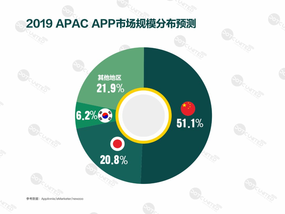 基于庞大的用户体量和日益提高的用户消费能力,在过去几年里,中国的应用市场一直保持强劲增长,在应用下载和消费者支出方面都领先全球。2019 年,中国将继续领跑亚太地区 APP 市场,市场规模占据整个亚太地区半壁江山。