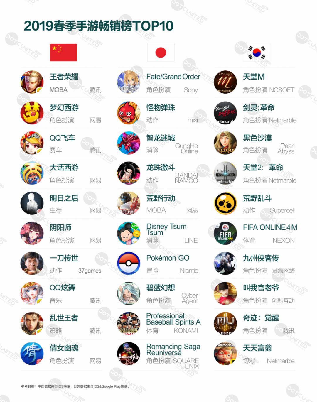 有数据显示,2019 年第一季度全球移动游戏收入达到 146 亿美元,其中在全球手游收入榜 TOP10 中,来自中国、日本、韩国的游戏共占 8 席。中国腾讯的 MOBA 手游《王者荣耀》、日本索尼的动漫 IP 手游《FGO》,以及韩国公司 NCSOFT 的游戏 IP 手游《天堂M》分居各国榜首,并全部入围第一季度全球手游 TOP5,这三款手游在各自国家,乃至全球的地位不言而喻。