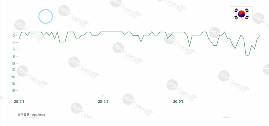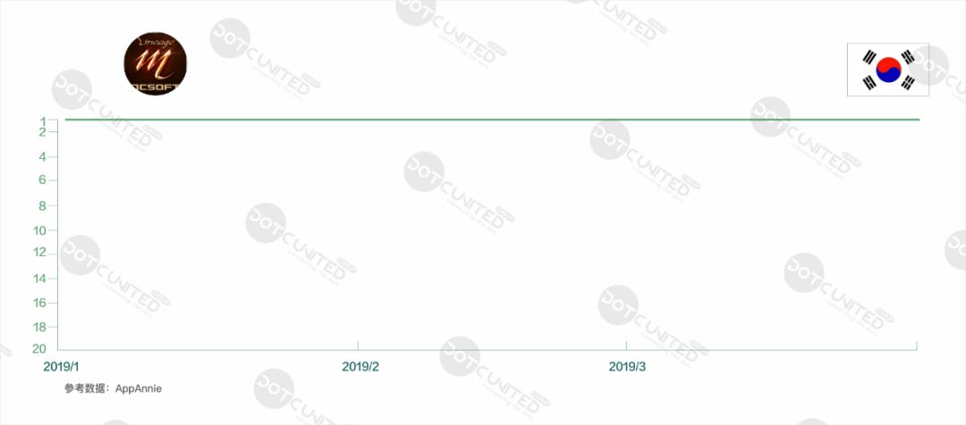韩国市场有着特别显著的收入头部集中的马太效应,在过去的 2018 年,韩国 TOP10 手游年收入几乎占整个手游市场收入的一半,而年度收入第一名的《天堂M》就占到手游市场的 22%,这点从 2019 年第一季度的榜单排名情况也可窥一斑,整个季度始终保持第一的这种稳定霸气的排名走势,在其他国家极为少见,《天堂 M》可谓韩国手游市场的无敌霸主。