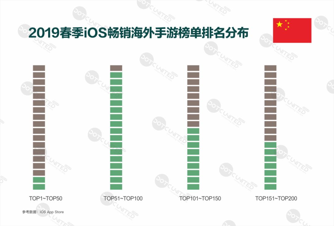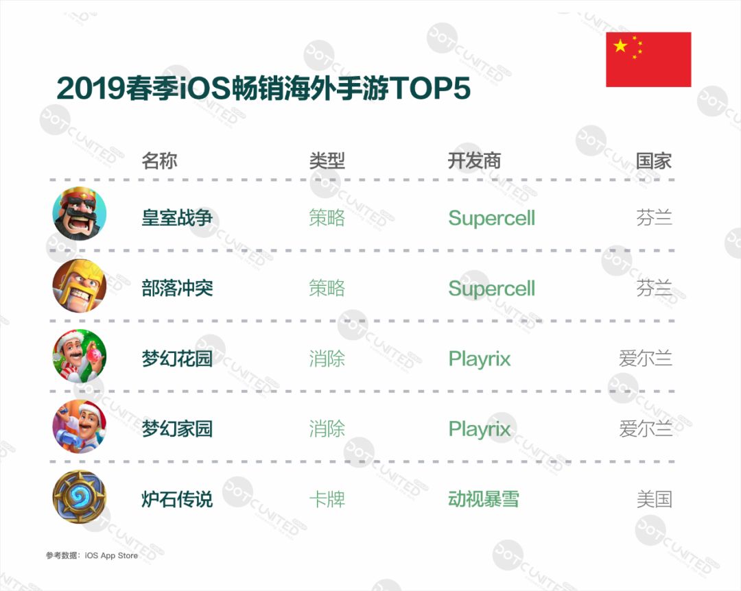 中国 iOS 畅销手游日榜单 TOP200 中,来自海外的游戏数量不足 20,且榜单排名基本在 50 名开外。2019 年第一季度,中国市场上表现良好的海外手游仍然是来自 Supercell 公司的 COC 系列《皇室战争》《部落冲突》以及 Playrix 公司的消除系列《梦幻花园》《梦幻家园》等。
