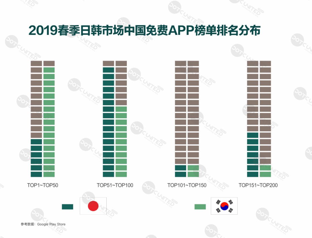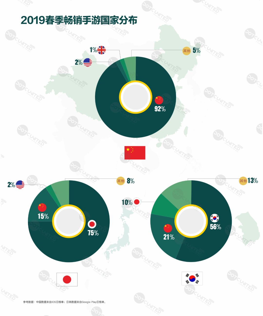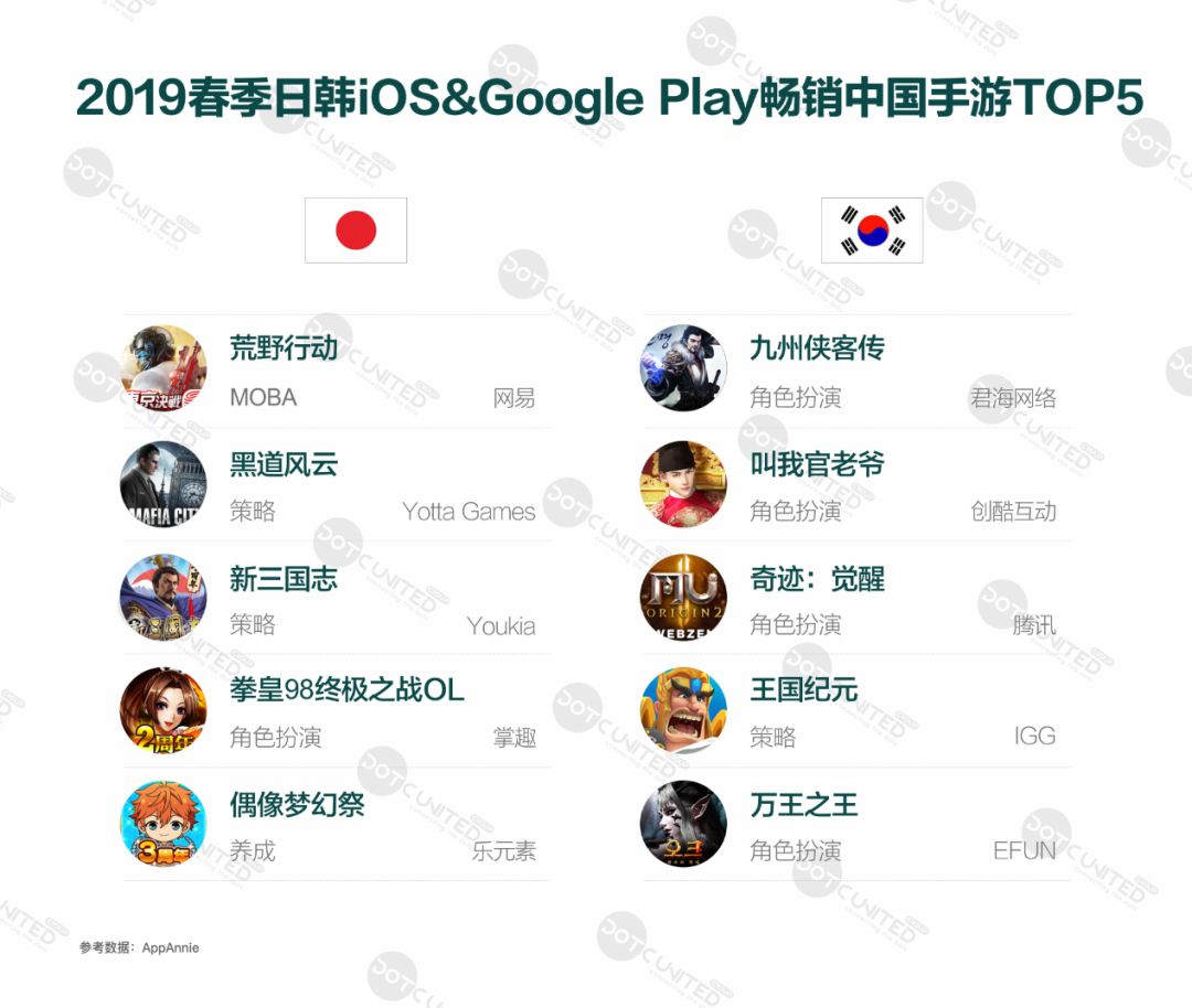 在日韩 Google Play 畅销手游日榜单 TOP200 中,来自中国的手游都占有极其重要的地位。日本 TOP200 中约有 30 款中国手游,TOP50 中占有 7~8 个席位。2019 年第一季度,MOBA 手游《荒野行动》继续领衔日本市场上的中国手游队列,成为日本玩家最爱的吃鸡手游。韩国 TOP200 中有超过 40 款中国手游,主要集中分布在 TOP100 内,武侠手游《九州侠客传》以黑马之势成为第一季度在韩国市场最受欢迎的中国手游。