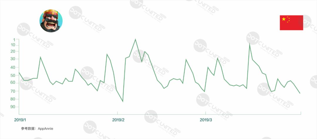 作为《部落冲突》 COC IP 的系列手游,《皇室战争》无疑是站在了巨人的肩膀上。《皇室战争》自 2016 年 3 月 2 日上线以来,全球营收已超过 30 亿美元。目前,在不考虑中国安卓市场的情况下,欧美地区仍是《皇室战争》最主要的市场。2019 年第一季度《皇室战争》在中国 iOS 畅销榜单基本徘徊在 50 名左右,从排名走势来看尚属稳定,该游戏在中国市场的生命周期或仍很长。